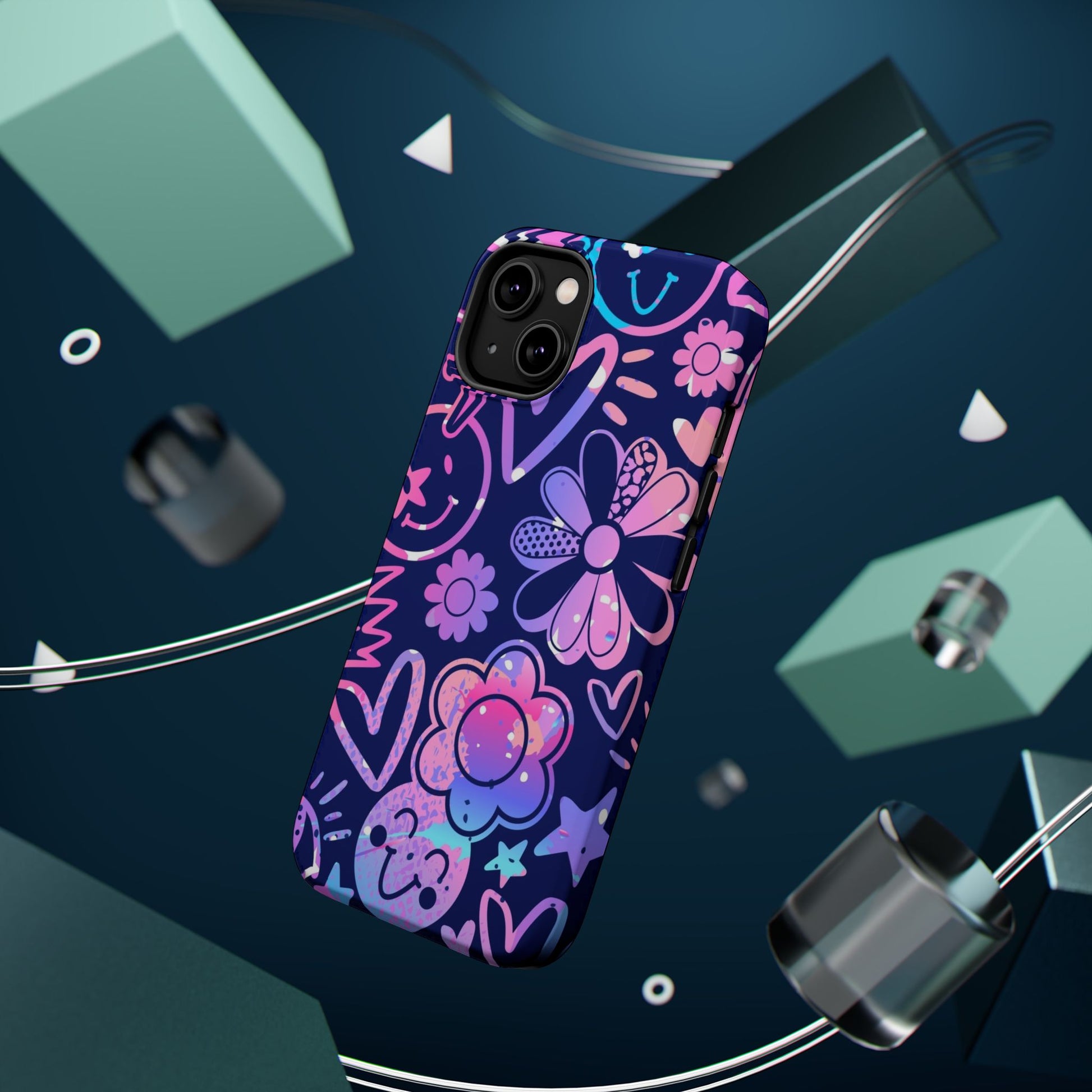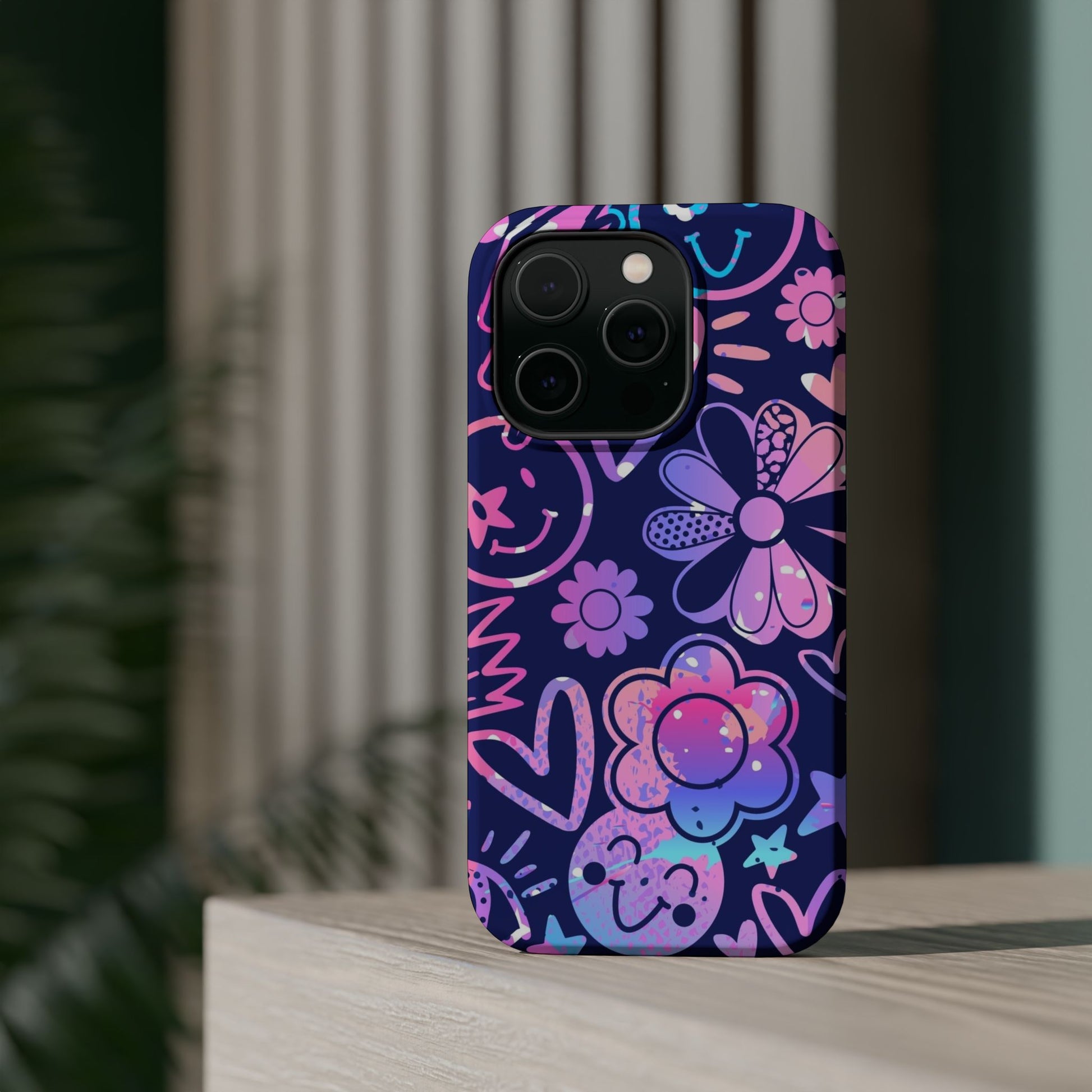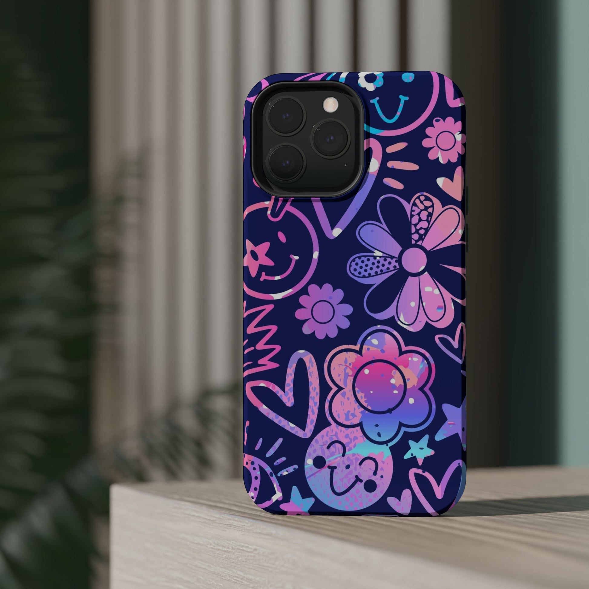 Ready to give your phone a super cool makeover? Check out our awesome purple phone case made for iPhone, Samsung Galaxy, and Google Pixel devices. Packed with happy images, smileys, and colorful flowers, this case is here to spread good vibes and inspiration to your daily life.