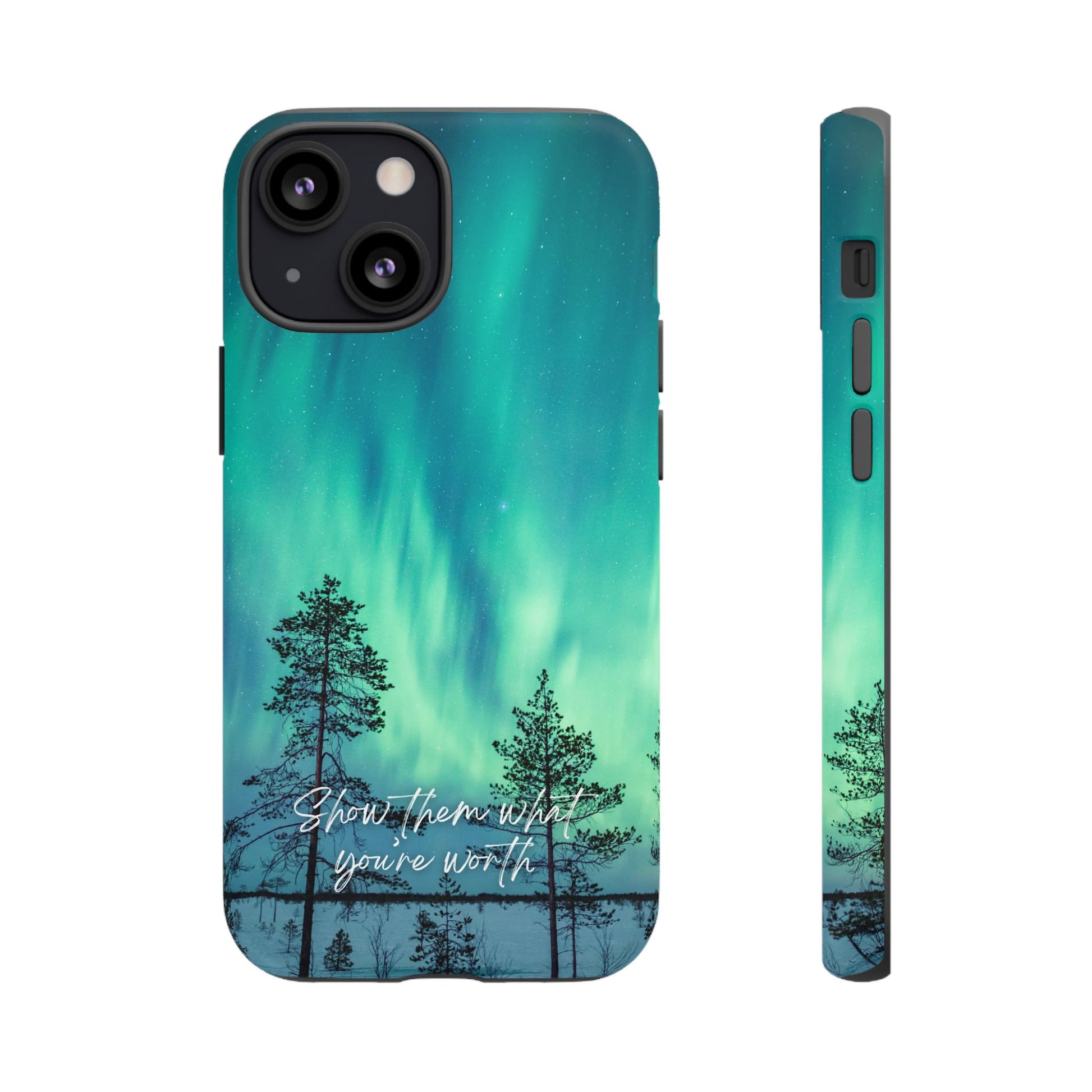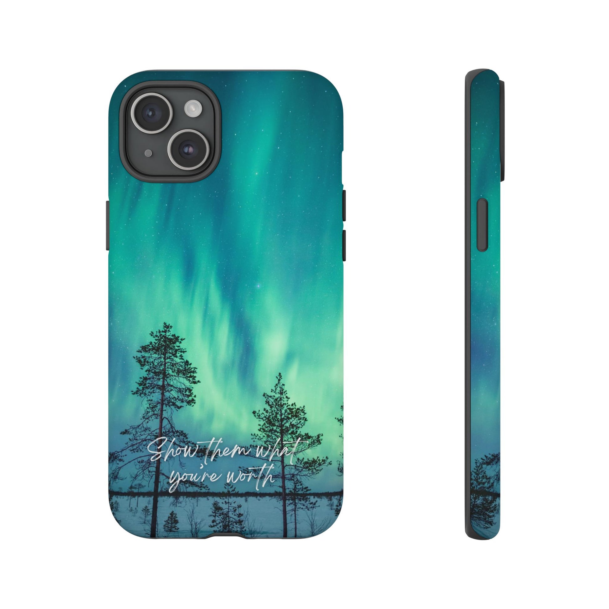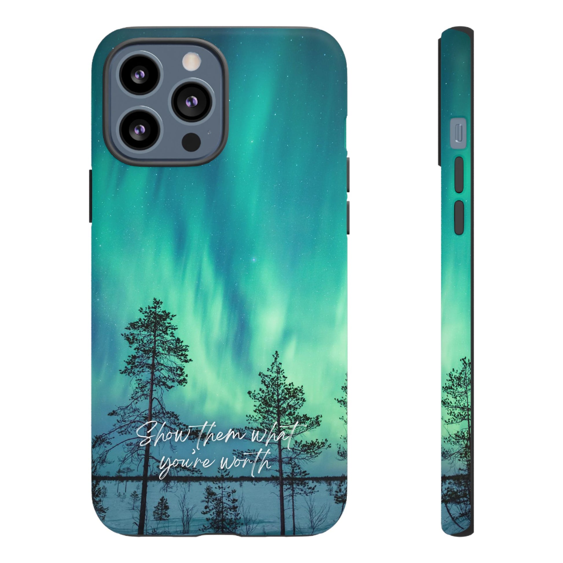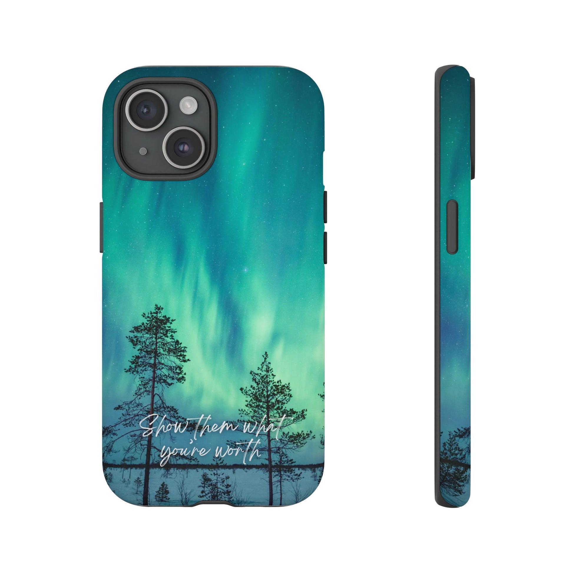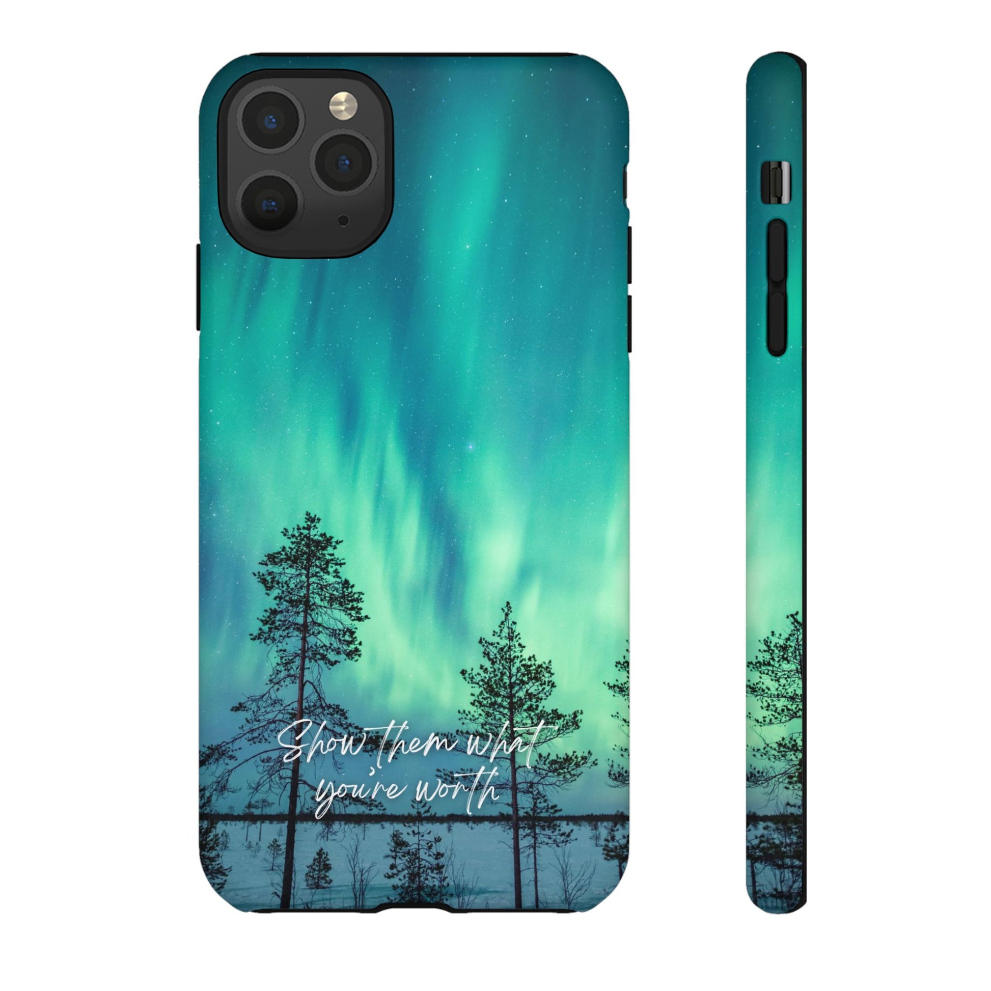 Designed to fit iPhone, Samsung Galaxy, and Google Pixel devices, this phone case combines functionality with artistry. Its sleek design protects your phone while displaying a breathtaking depiction of the Northern Lights. To add a touch of empowerment, it features an uplifting inscription: *"Show them what you're worth."* Like the Northern Lights themselves, this quote reminds you to shine brightly and inspire others.