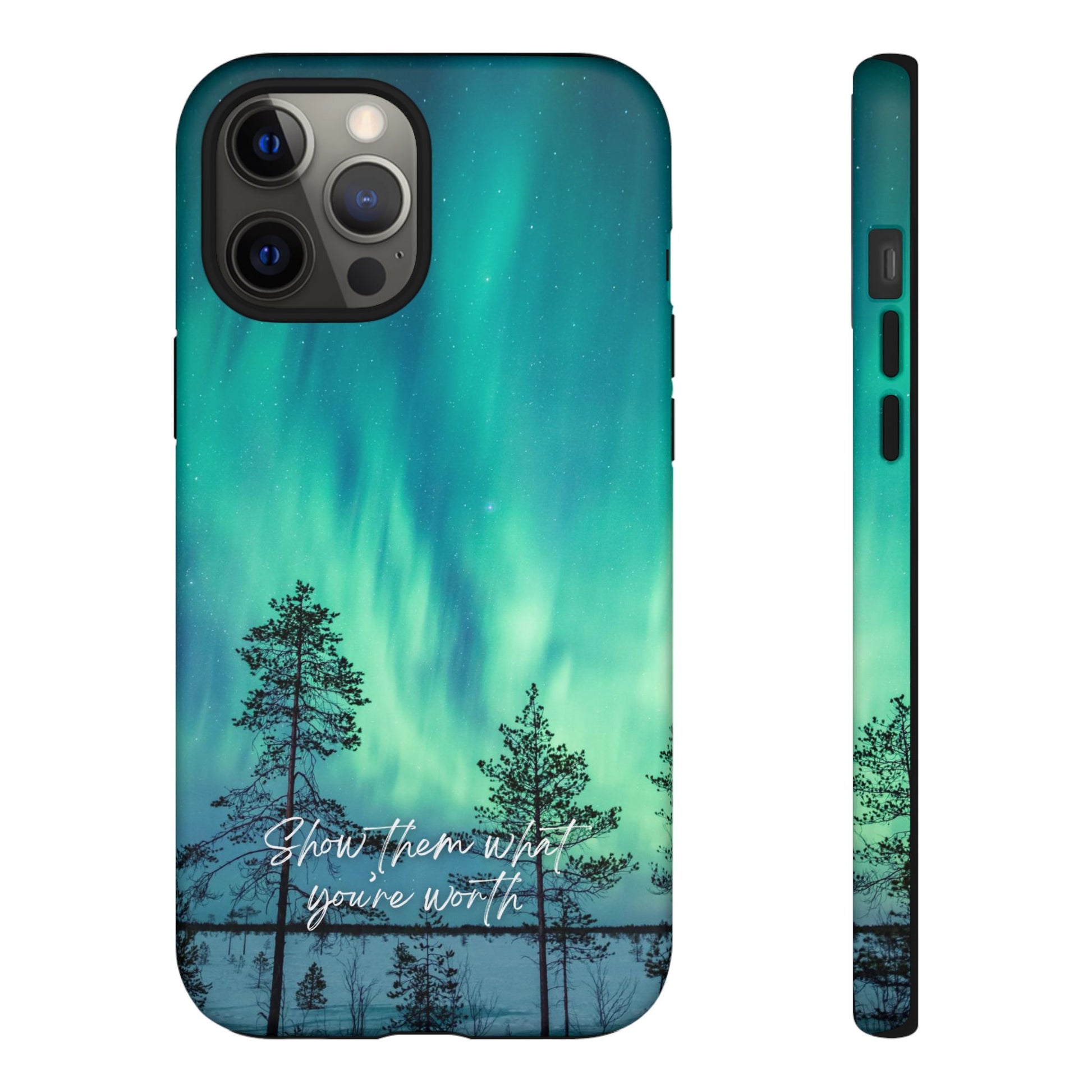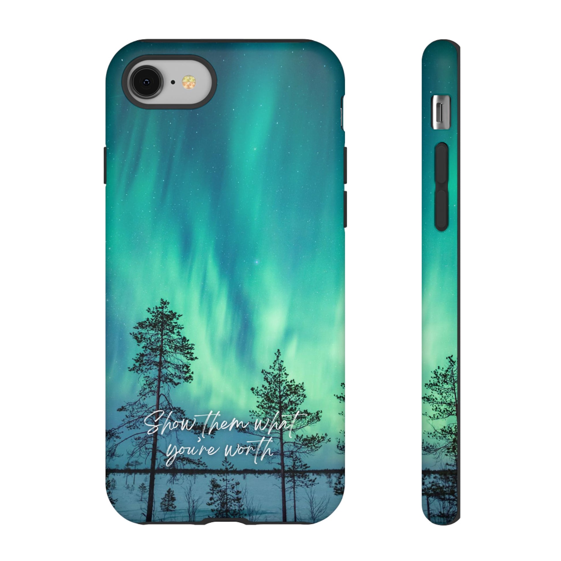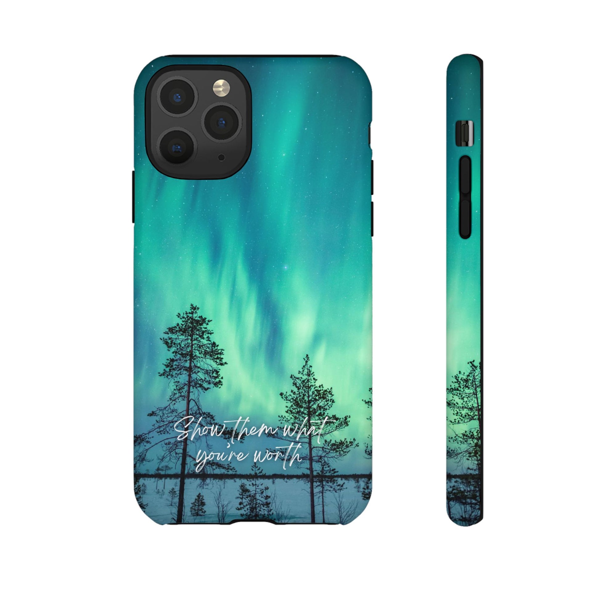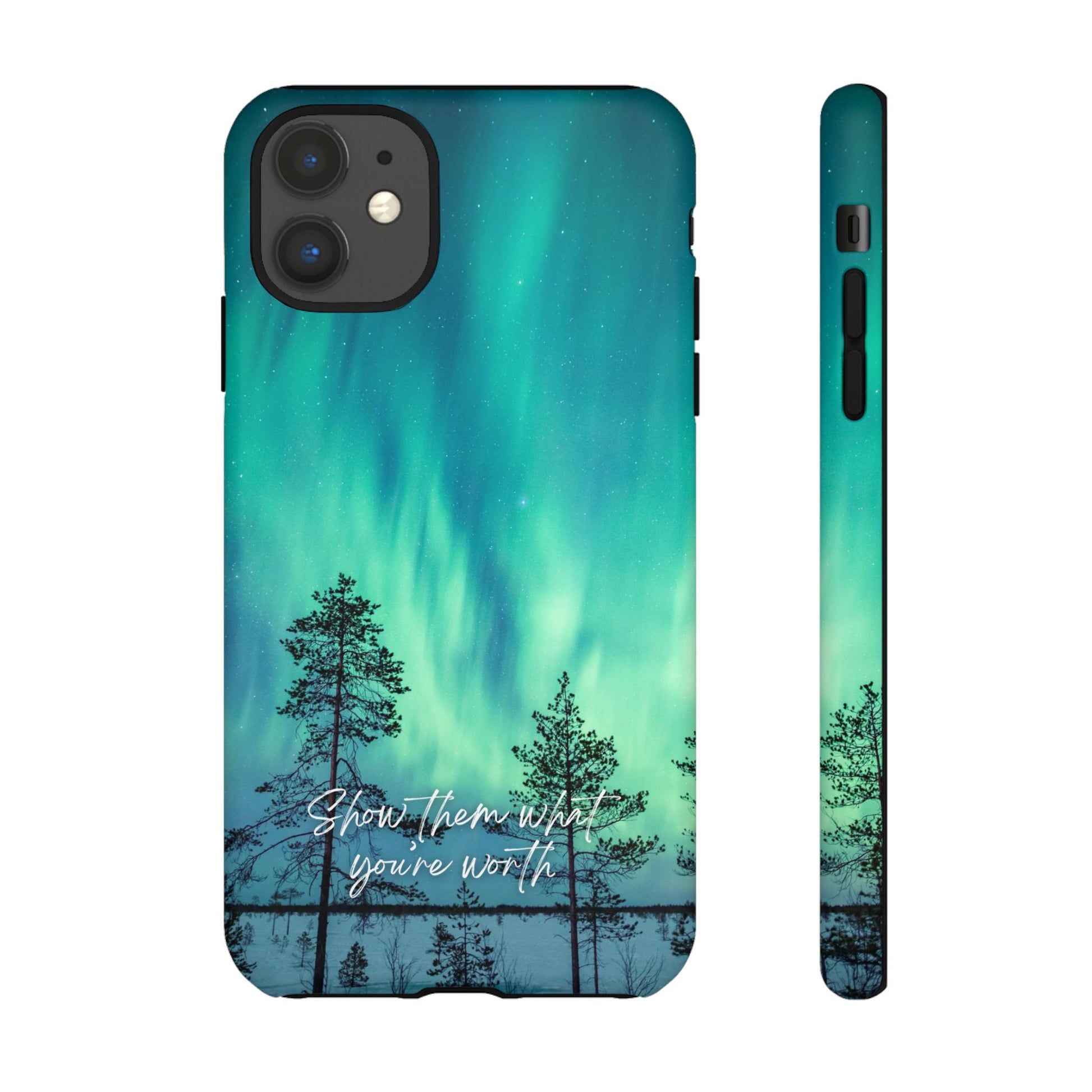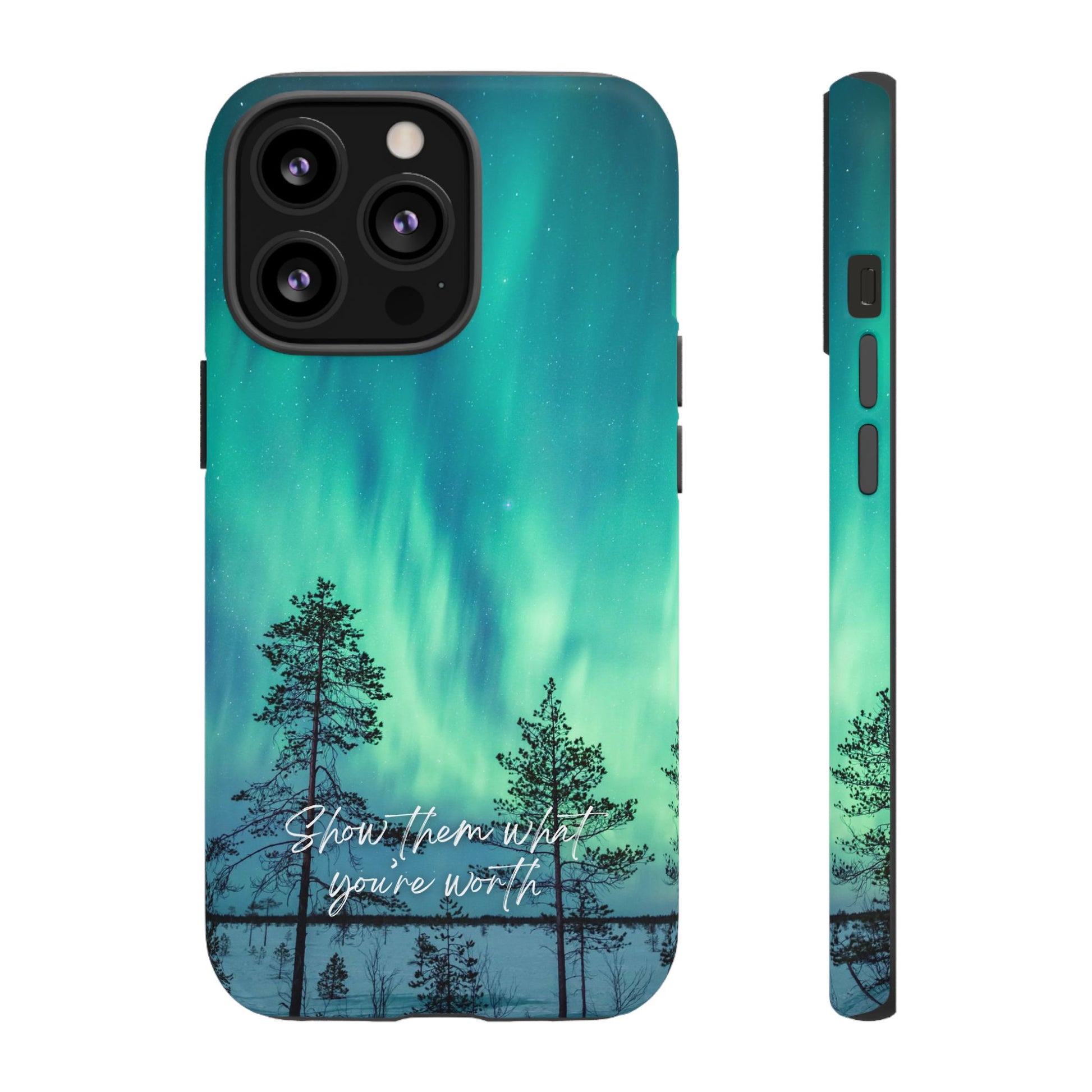 Designed to fit iPhone, Samsung Galaxy, and Google Pixel devices, this phone case combines functionality with artistry. Its sleek design protects your phone while displaying a breathtaking depiction of the Northern Lights. To add a touch of empowerment, it features an uplifting inscription: *"Show them what you're worth."* Like the Northern Lights themselves, this quote reminds you to shine brightly and inspire others.