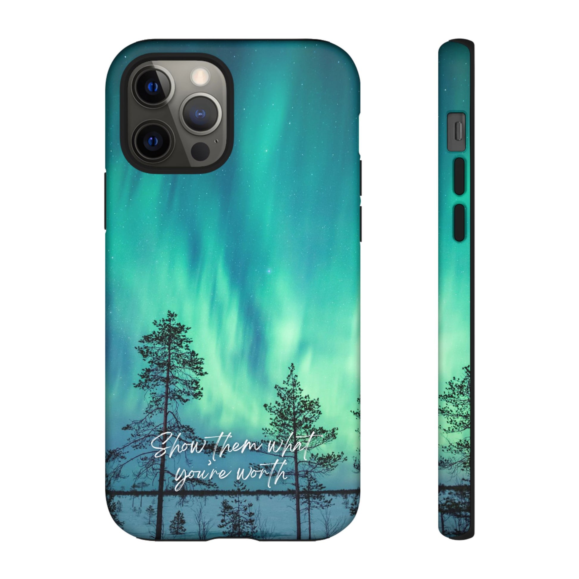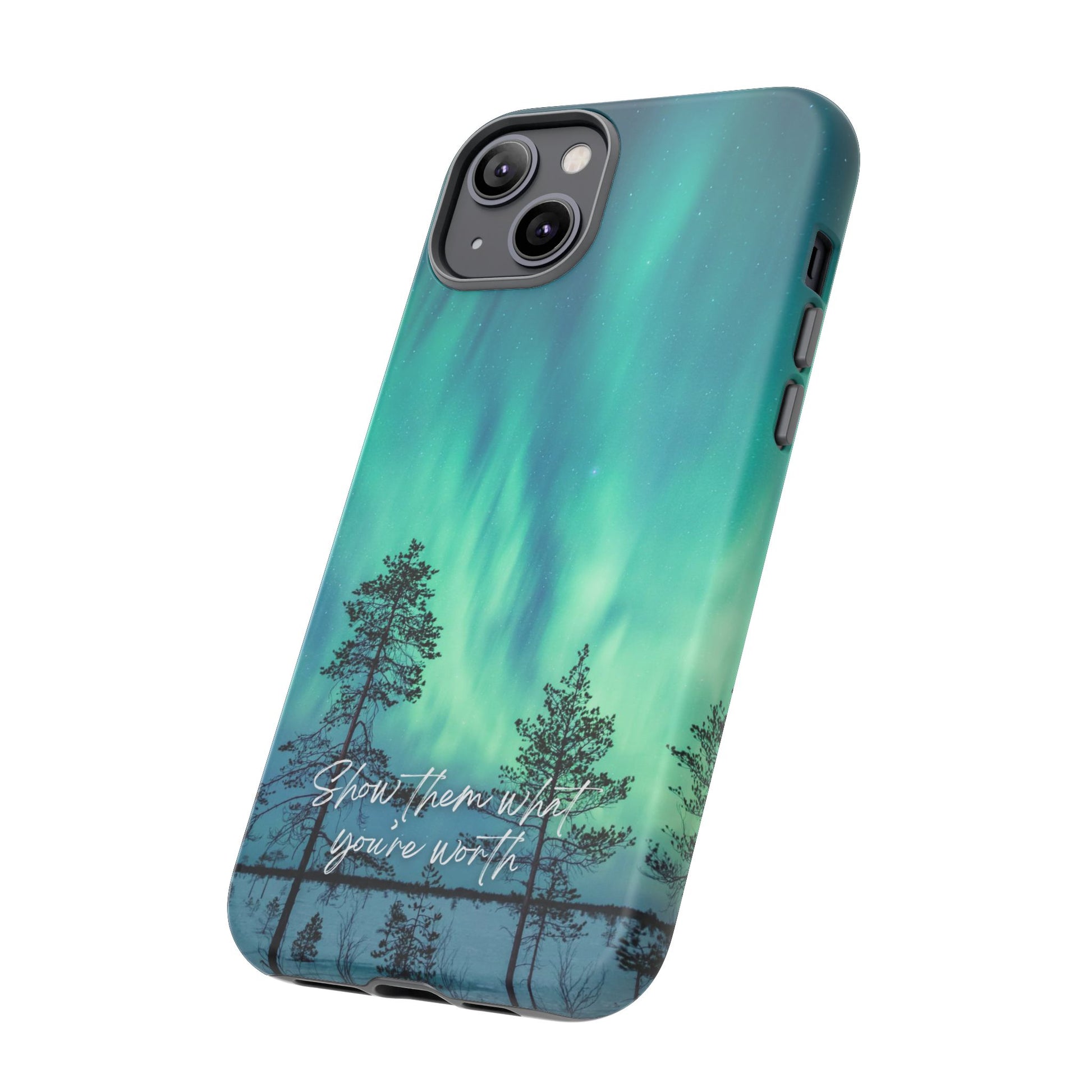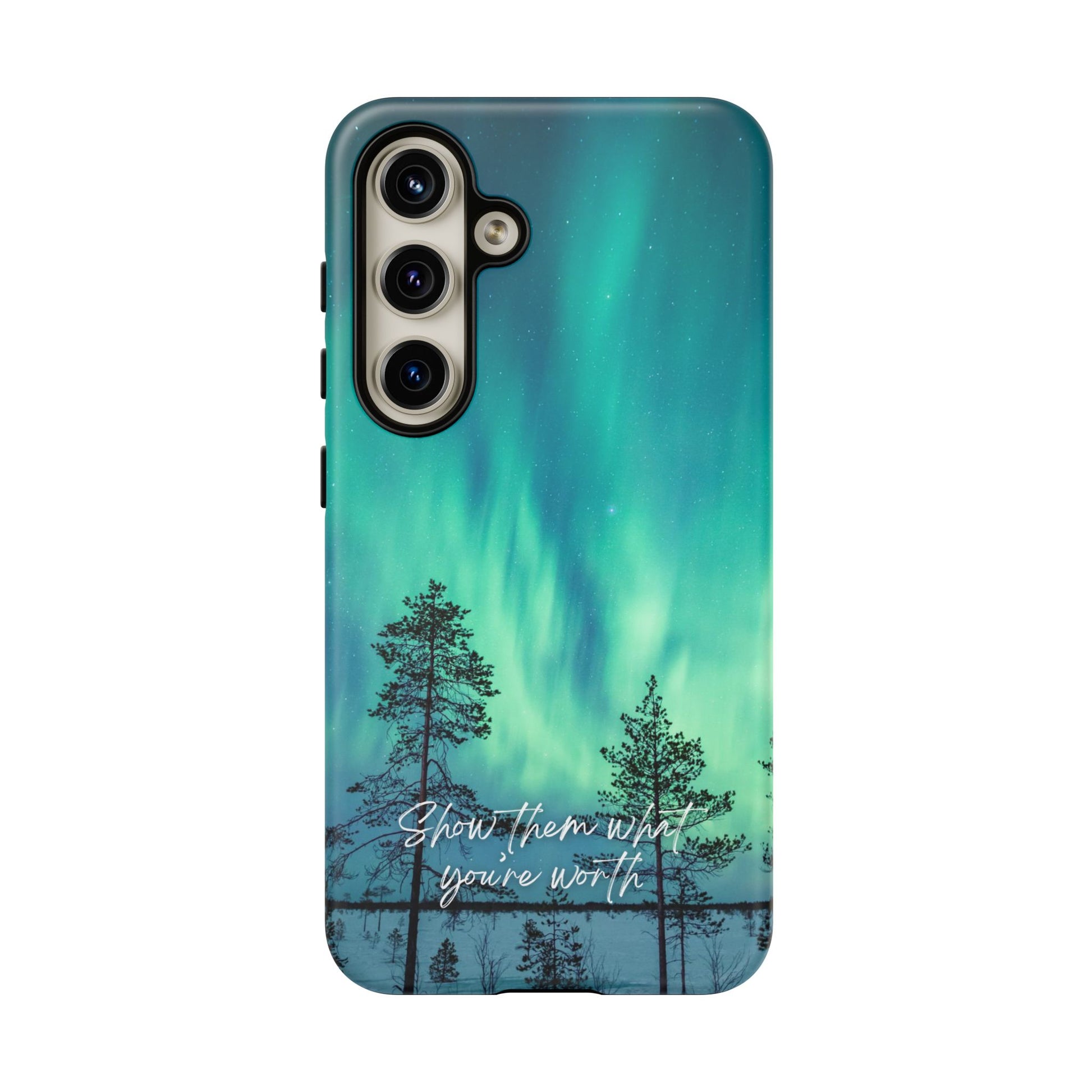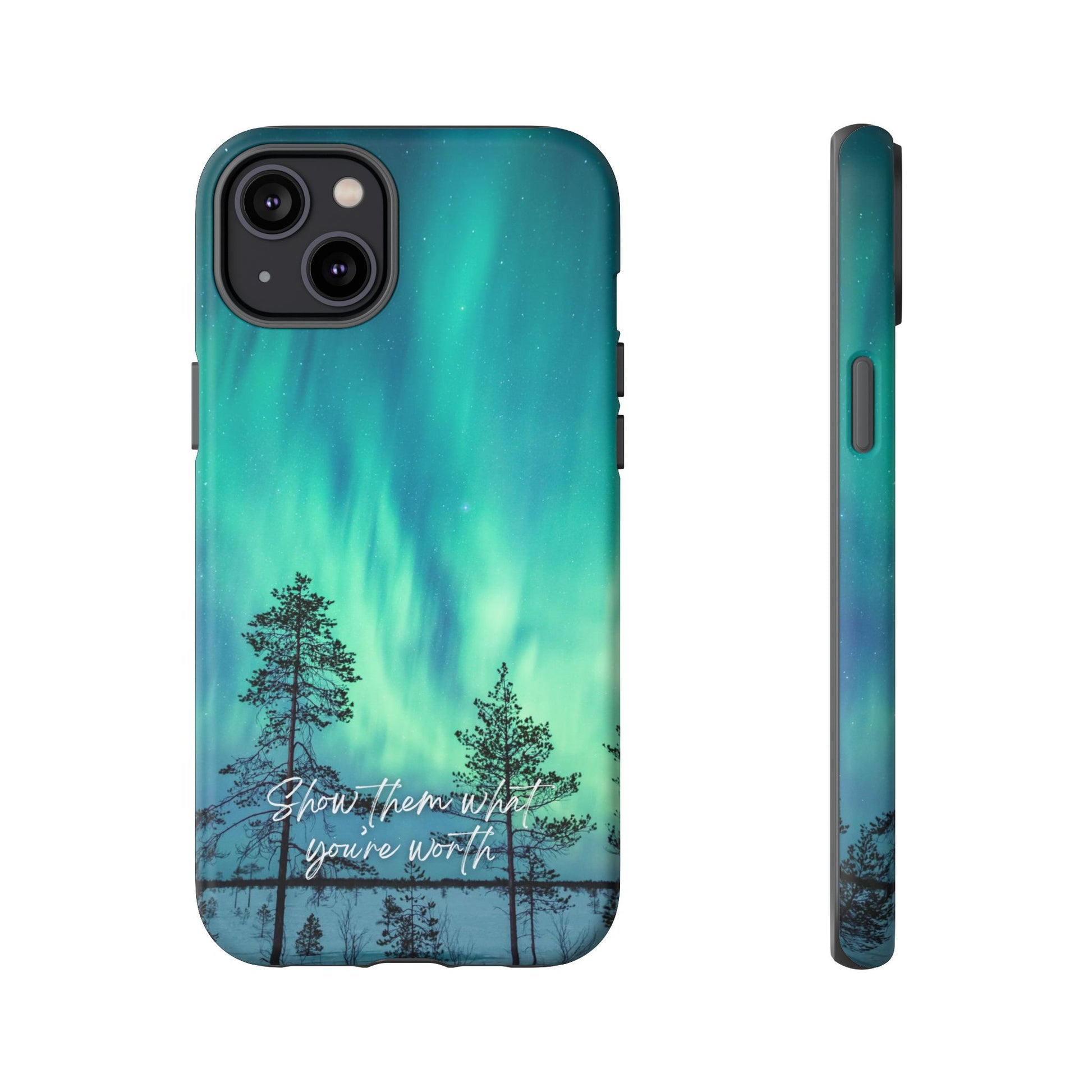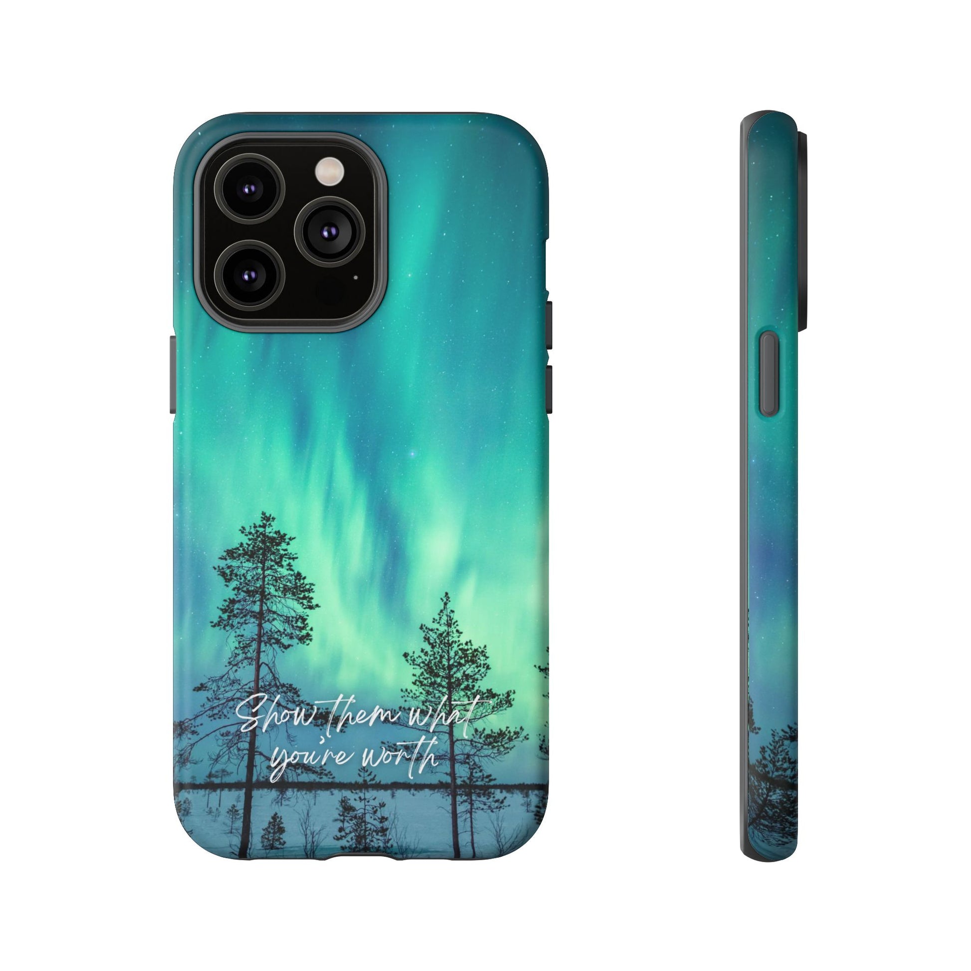 Designed to fit iPhone, Samsung Galaxy, and Google Pixel devices, this phone case combines functionality with artistry. Its sleek design protects your phone while displaying a breathtaking depiction of the Northern Lights. To add a touch of empowerment, it features an uplifting inscription: *"Show them what you're worth."* Like the Northern Lights themselves, this quote reminds you to shine brightly and inspire others.