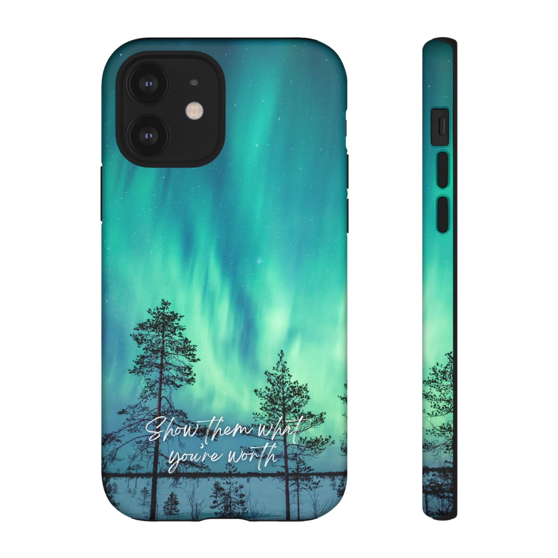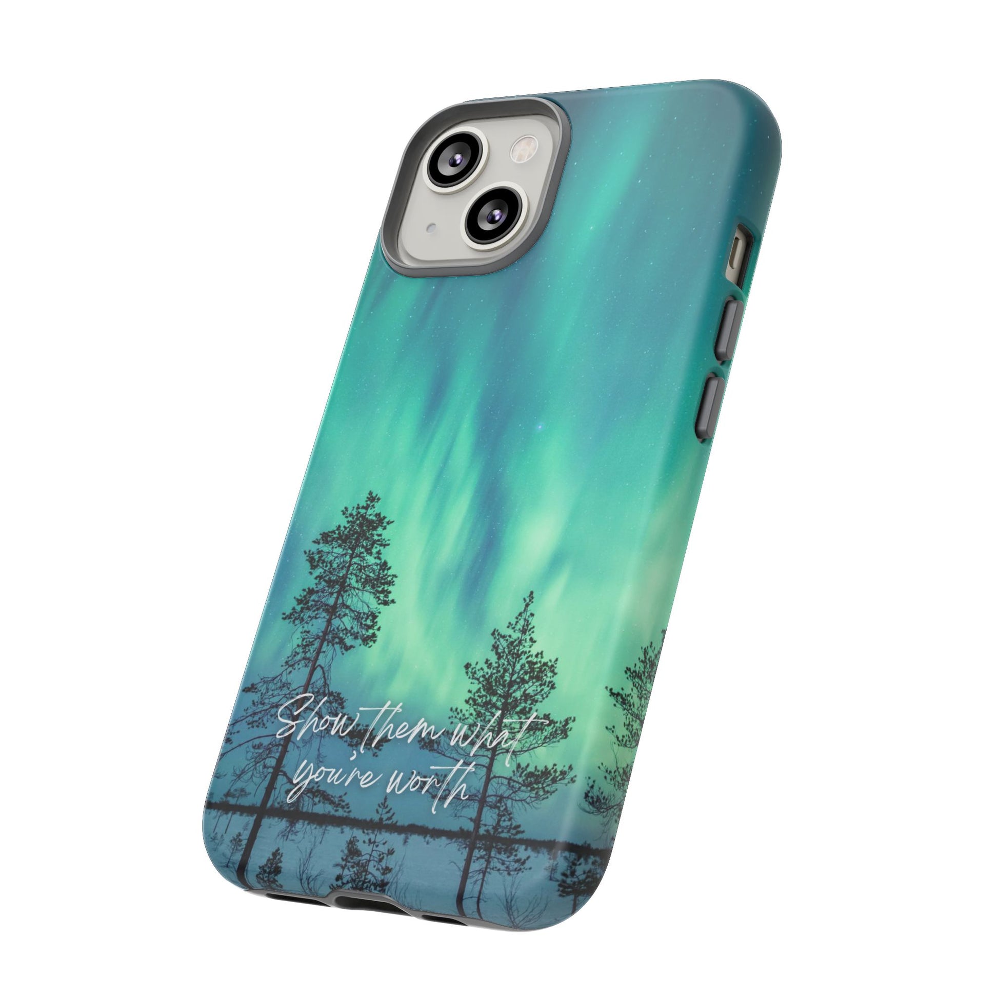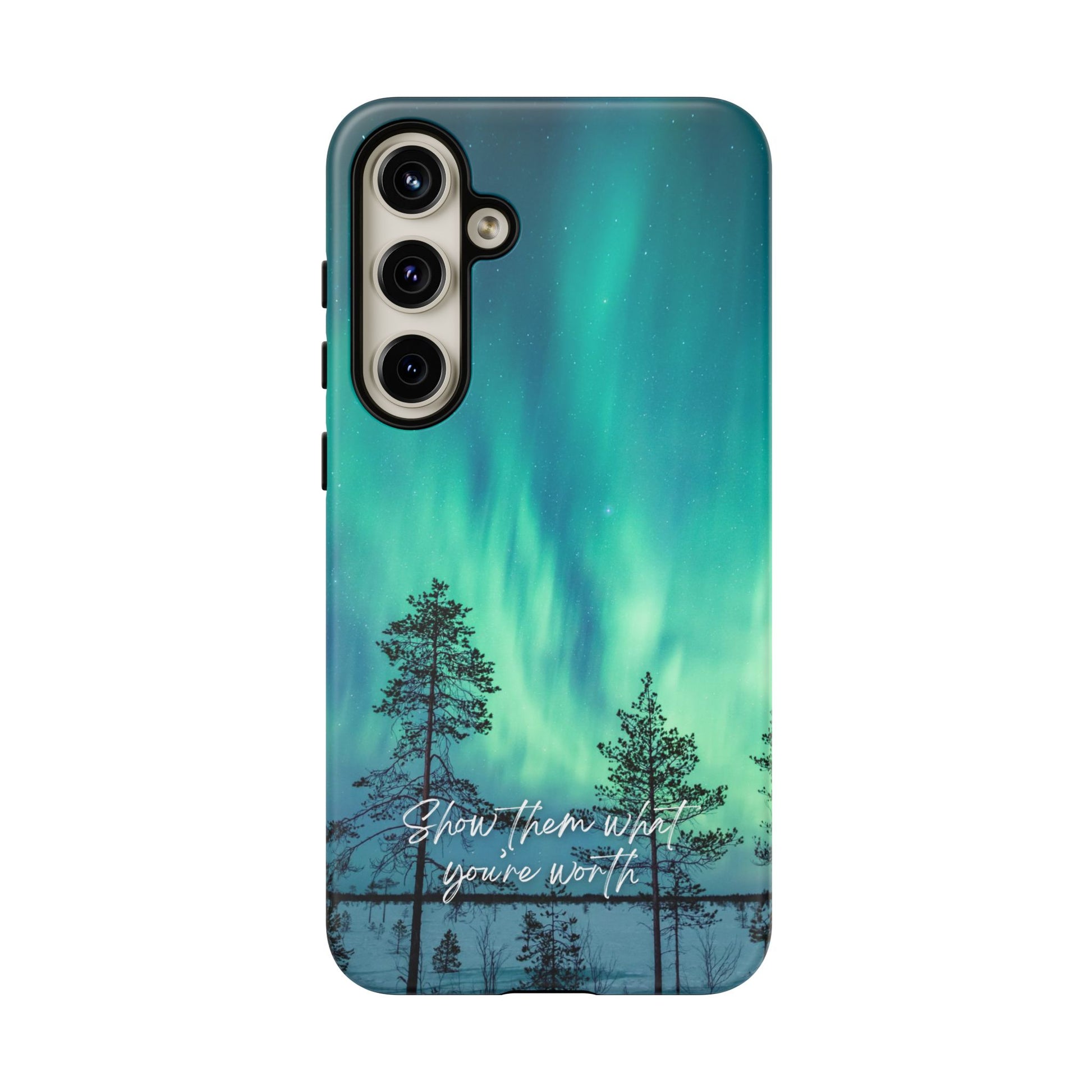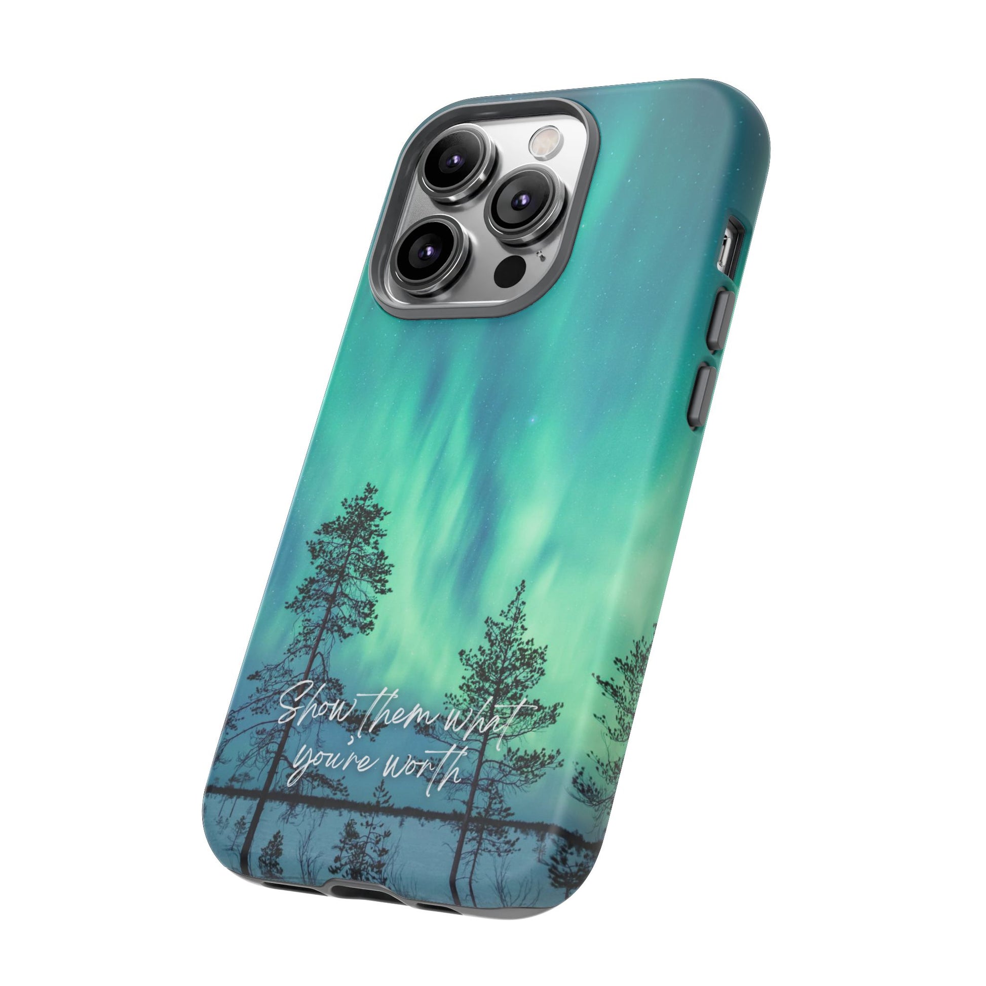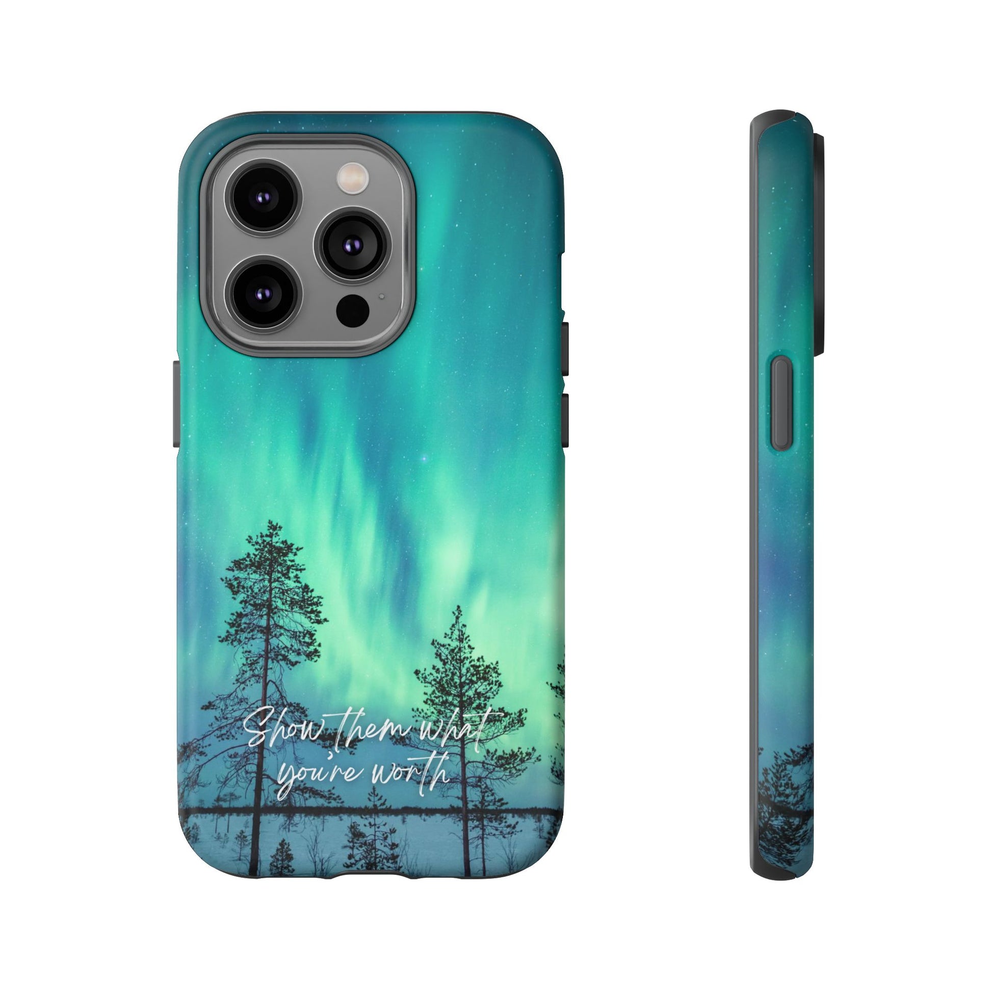 Designed to fit iPhone, Samsung Galaxy, and Google Pixel devices, this phone case combines functionality with artistry. Its sleek design protects your phone while displaying a breathtaking depiction of the Northern Lights. To add a touch of empowerment, it features an uplifting inscription: *"Show them what you're worth."* Like the Northern Lights themselves, this quote reminds you to shine brightly and inspire others.