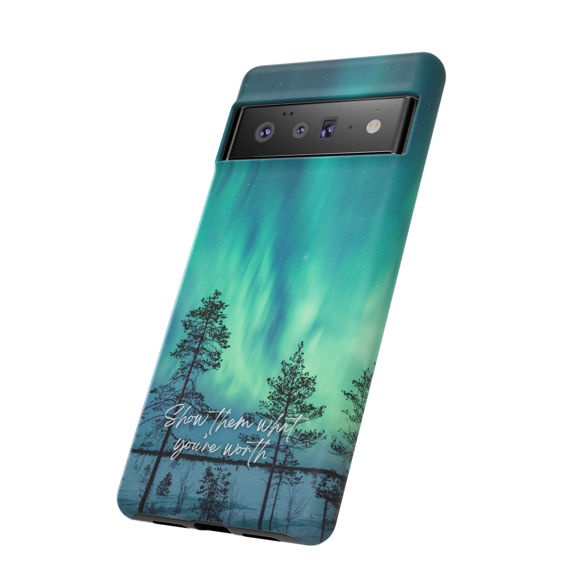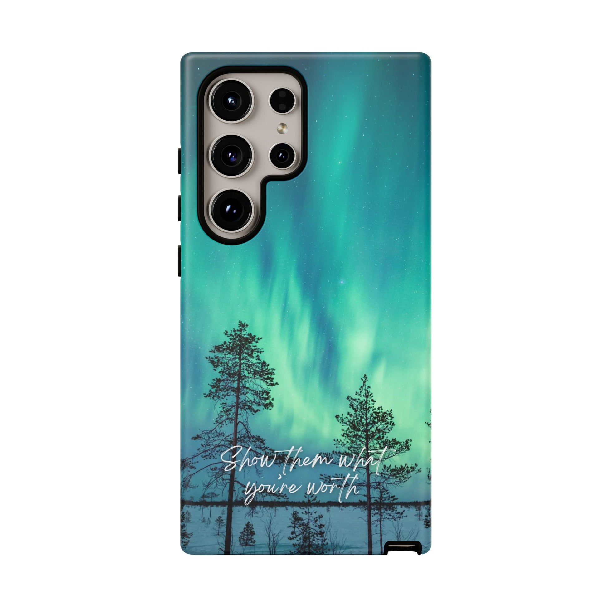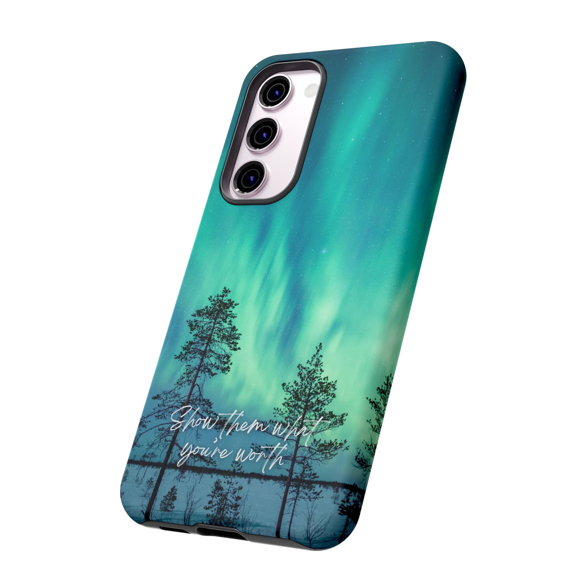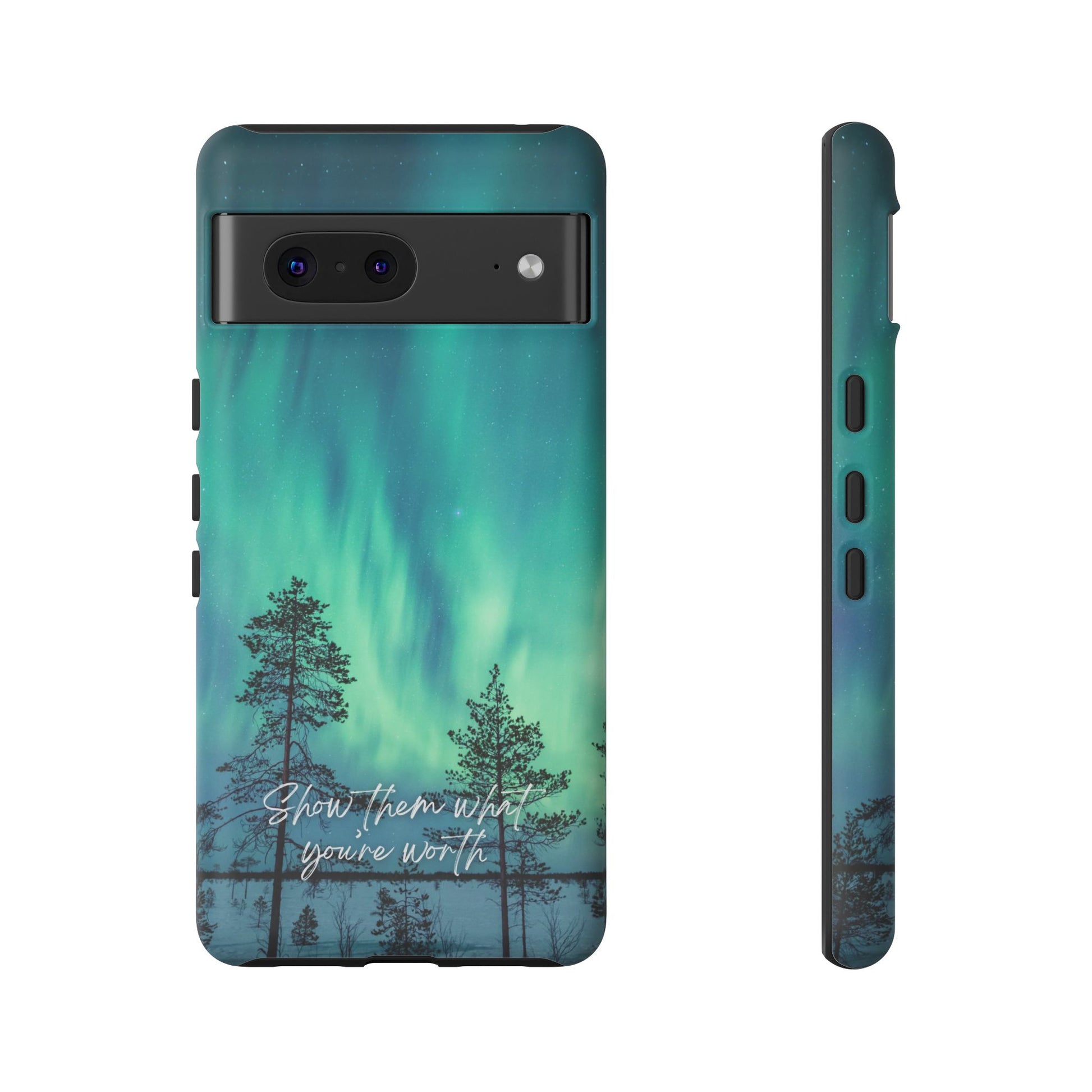 Designed to fit iPhone, Samsung Galaxy, and Google Pixel devices, this phone case combines functionality with artistry. Its sleek design protects your phone while displaying a breathtaking depiction of the Northern Lights. To add a touch of empowerment, it features an uplifting inscription: *"Show them what you're worth."* Like the Northern Lights themselves, this quote reminds you to shine brightly and inspire others.