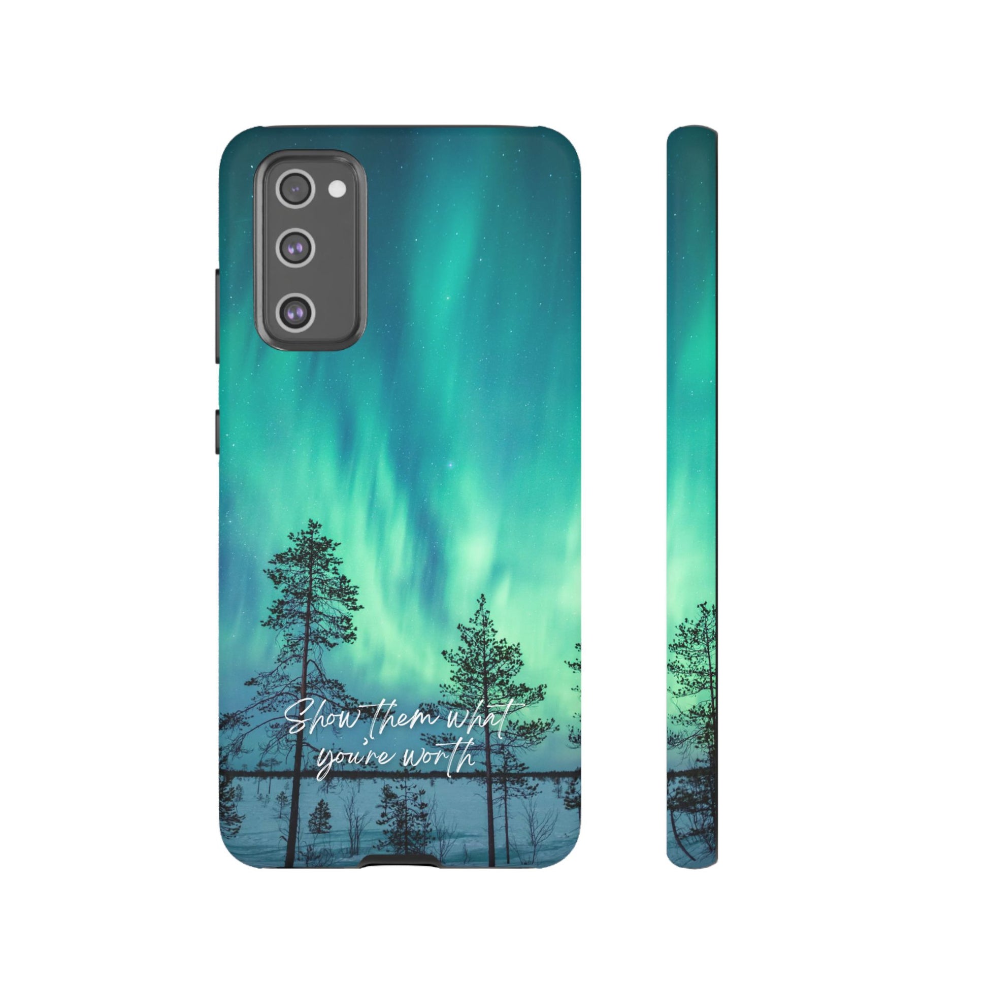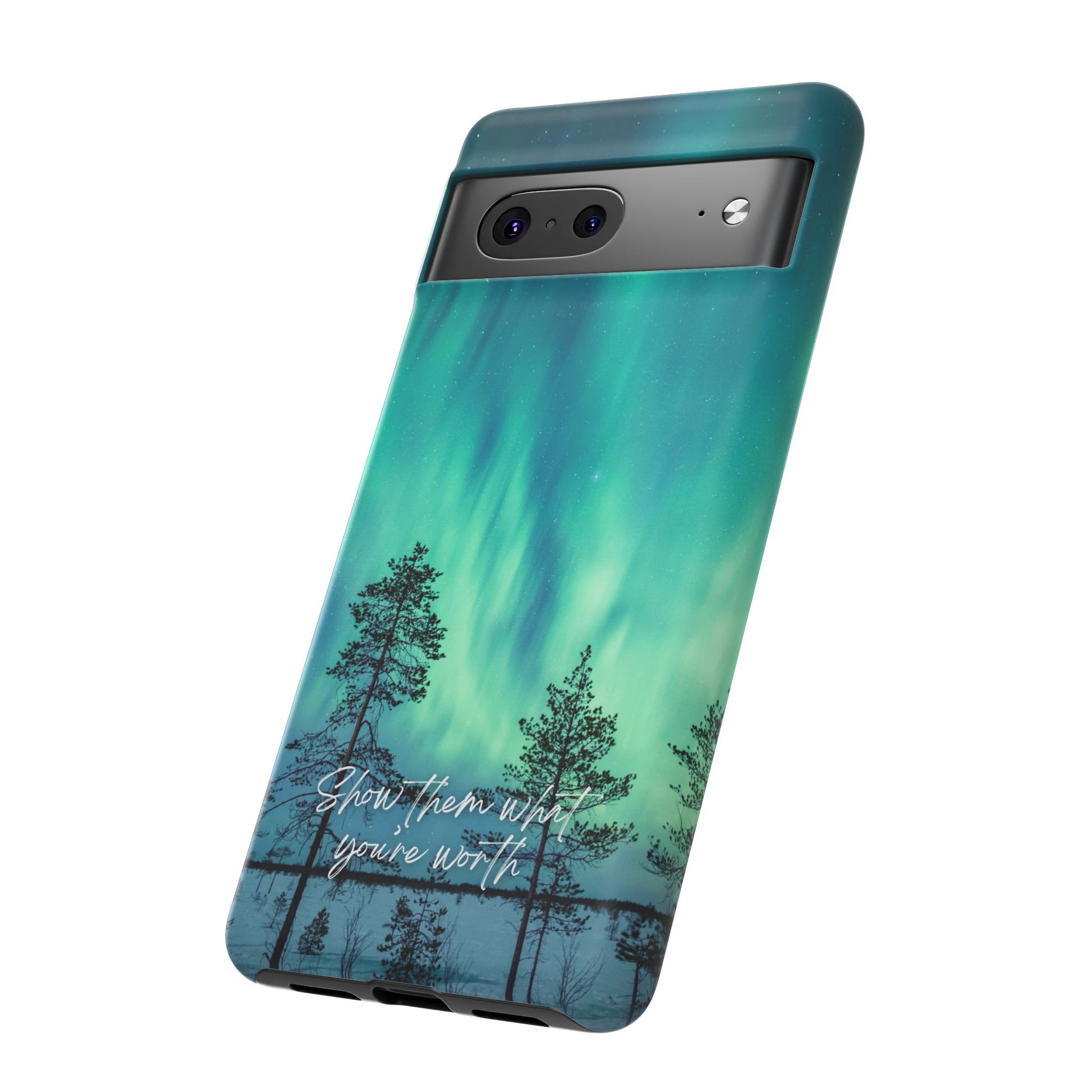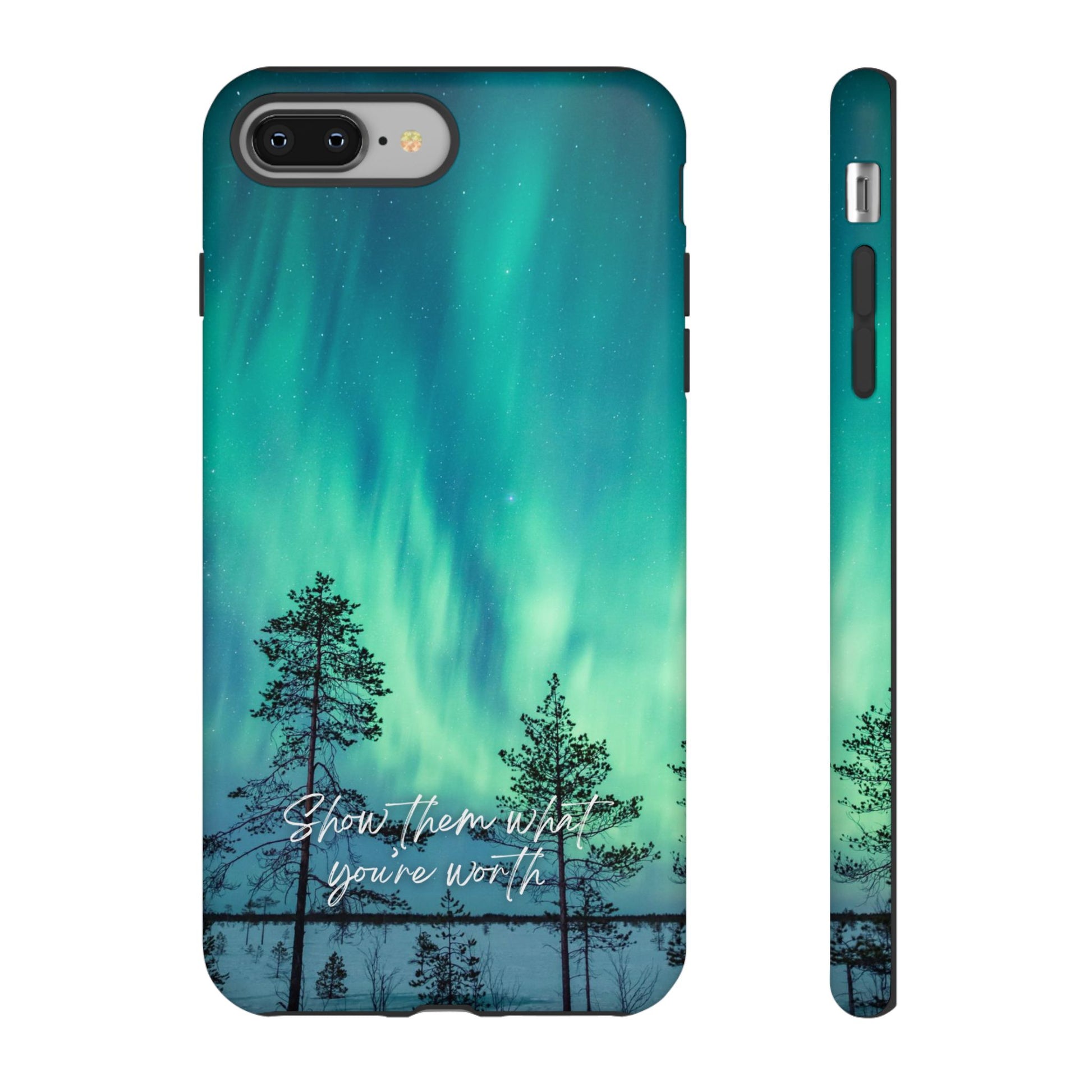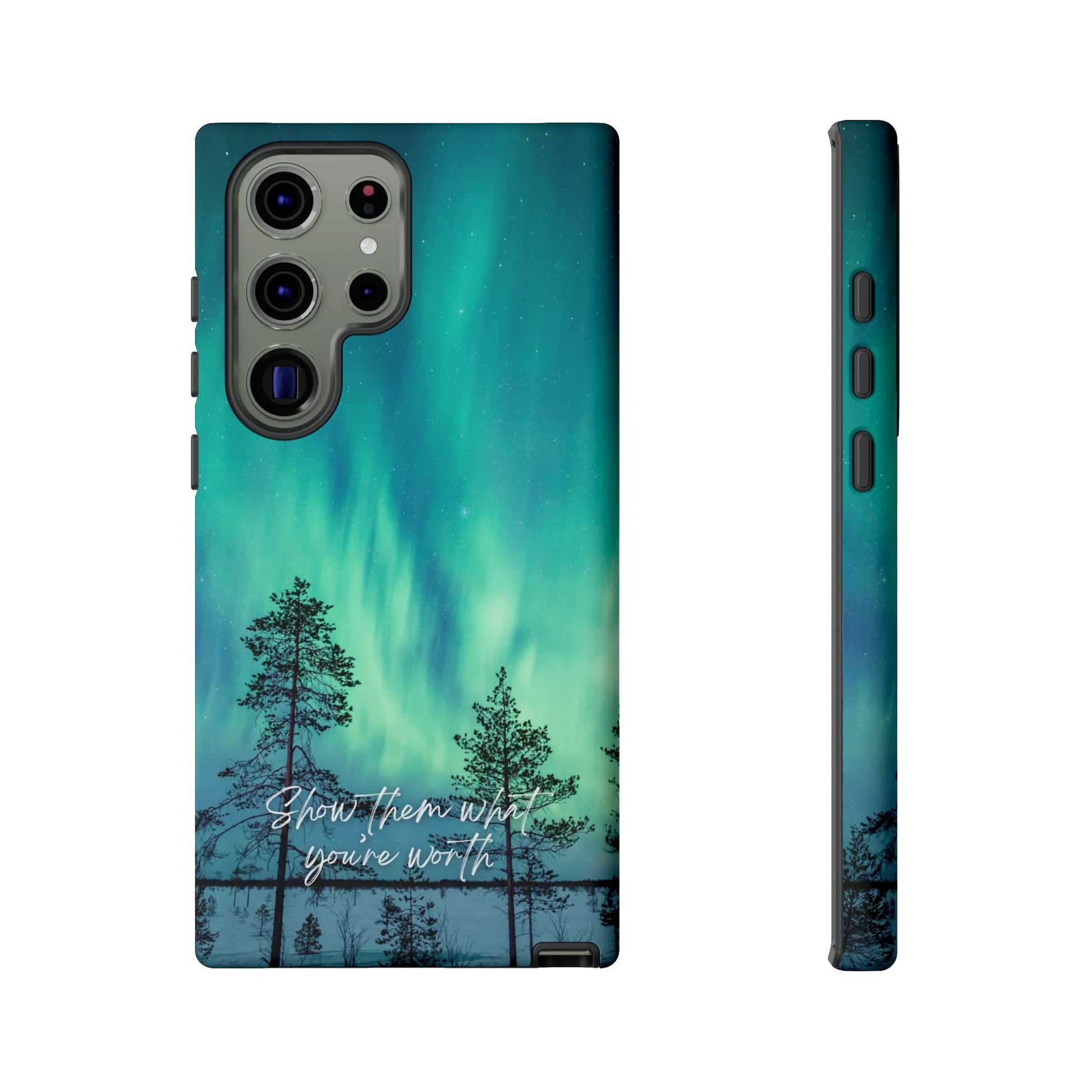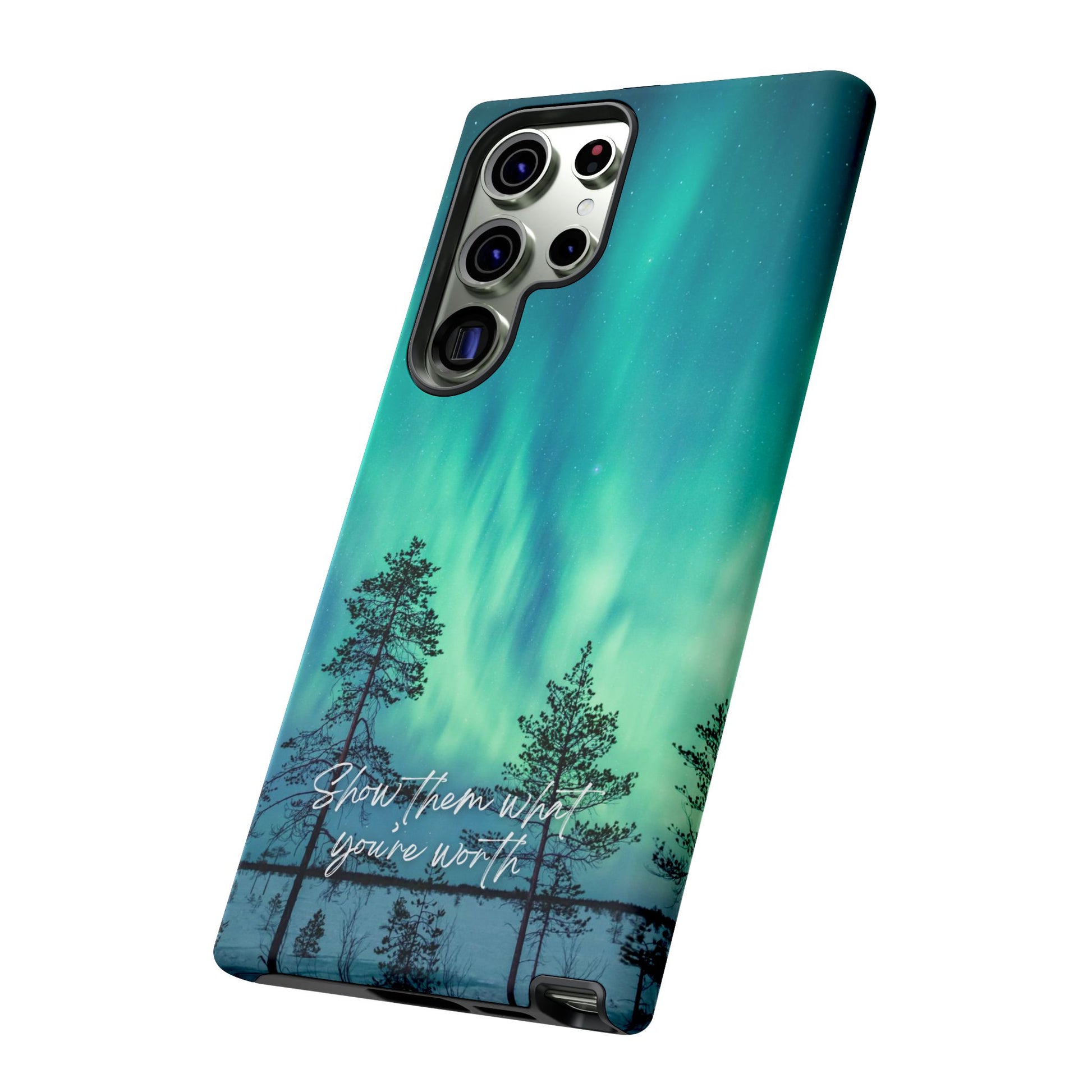 Designed to fit iPhone, Samsung Galaxy, and Google Pixel devices, this phone case combines functionality with artistry. Its sleek design protects your phone while displaying a breathtaking depiction of the Northern Lights. To add a touch of empowerment, it features an uplifting inscription: *"Show them what you're worth."* Like the Northern Lights themselves, this quote reminds you to shine brightly and inspire others.