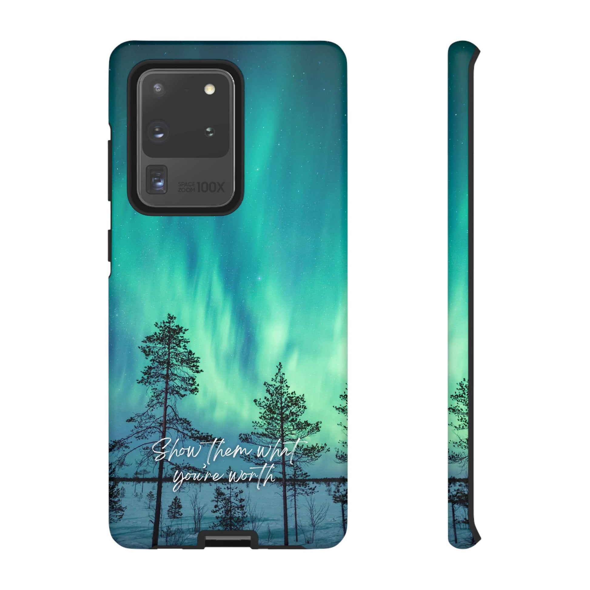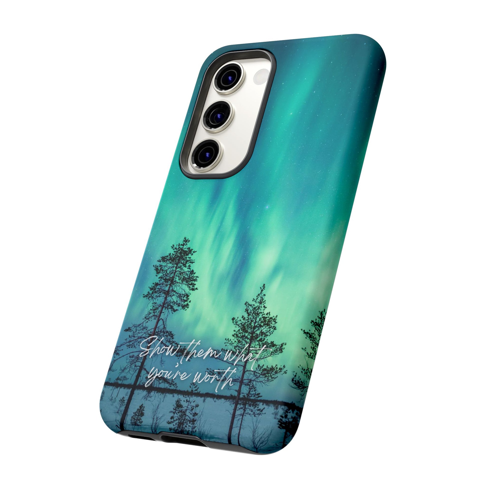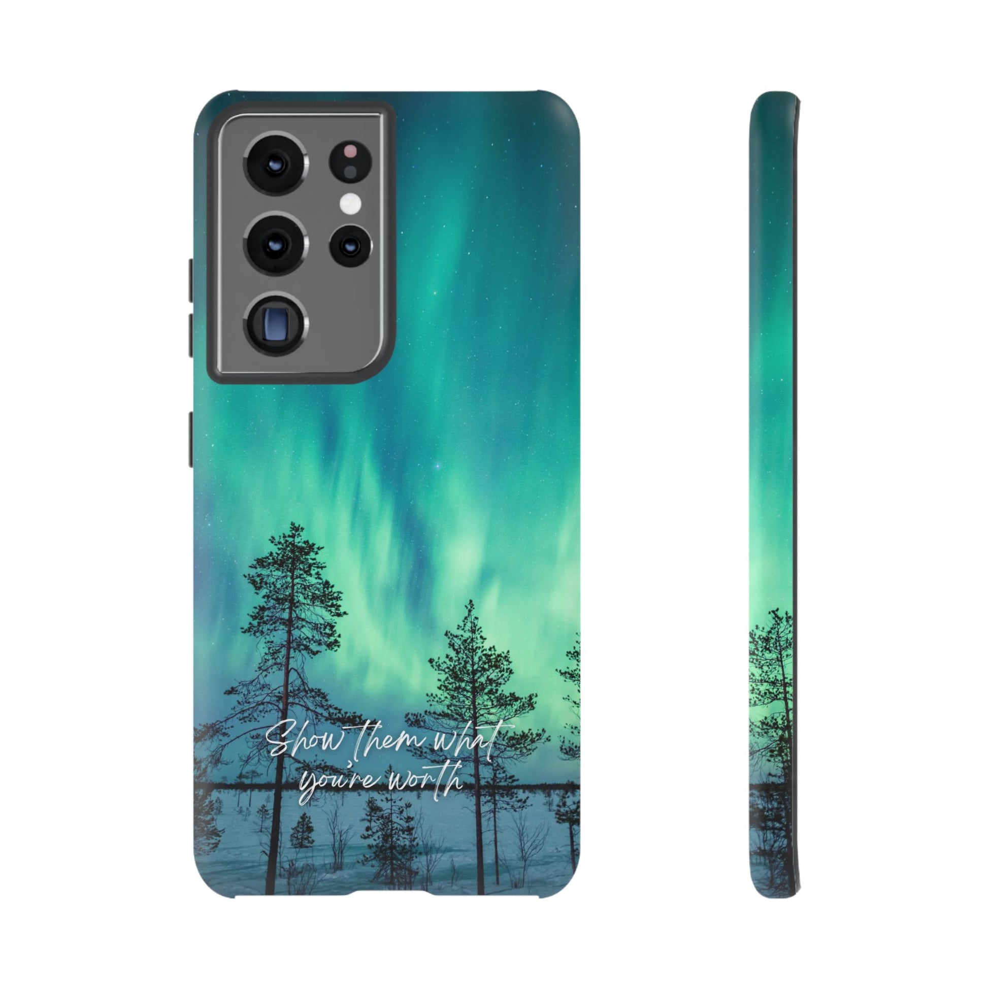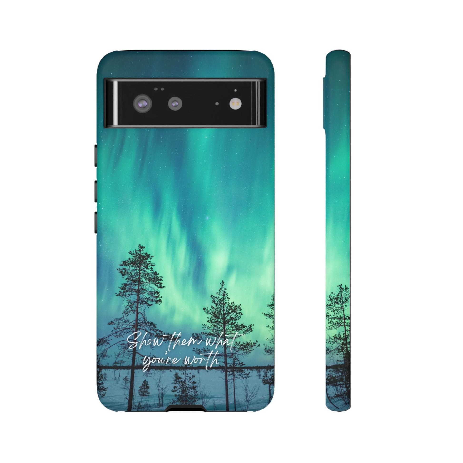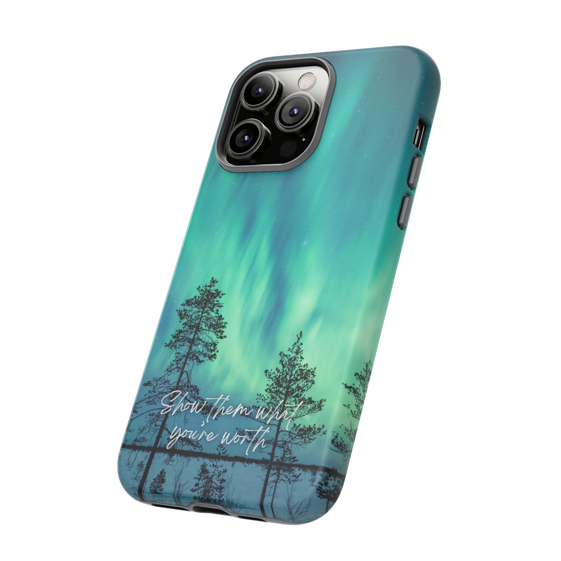 Designed to fit iPhone, Samsung Galaxy, and Google Pixel devices, this phone case combines functionality with artistry. Its sleek design protects your phone while displaying a breathtaking depiction of the Northern Lights. To add a touch of empowerment, it features an uplifting inscription: *"Show them what you're worth."* Like the Northern Lights themselves, this quote reminds you to shine brightly and inspire others.