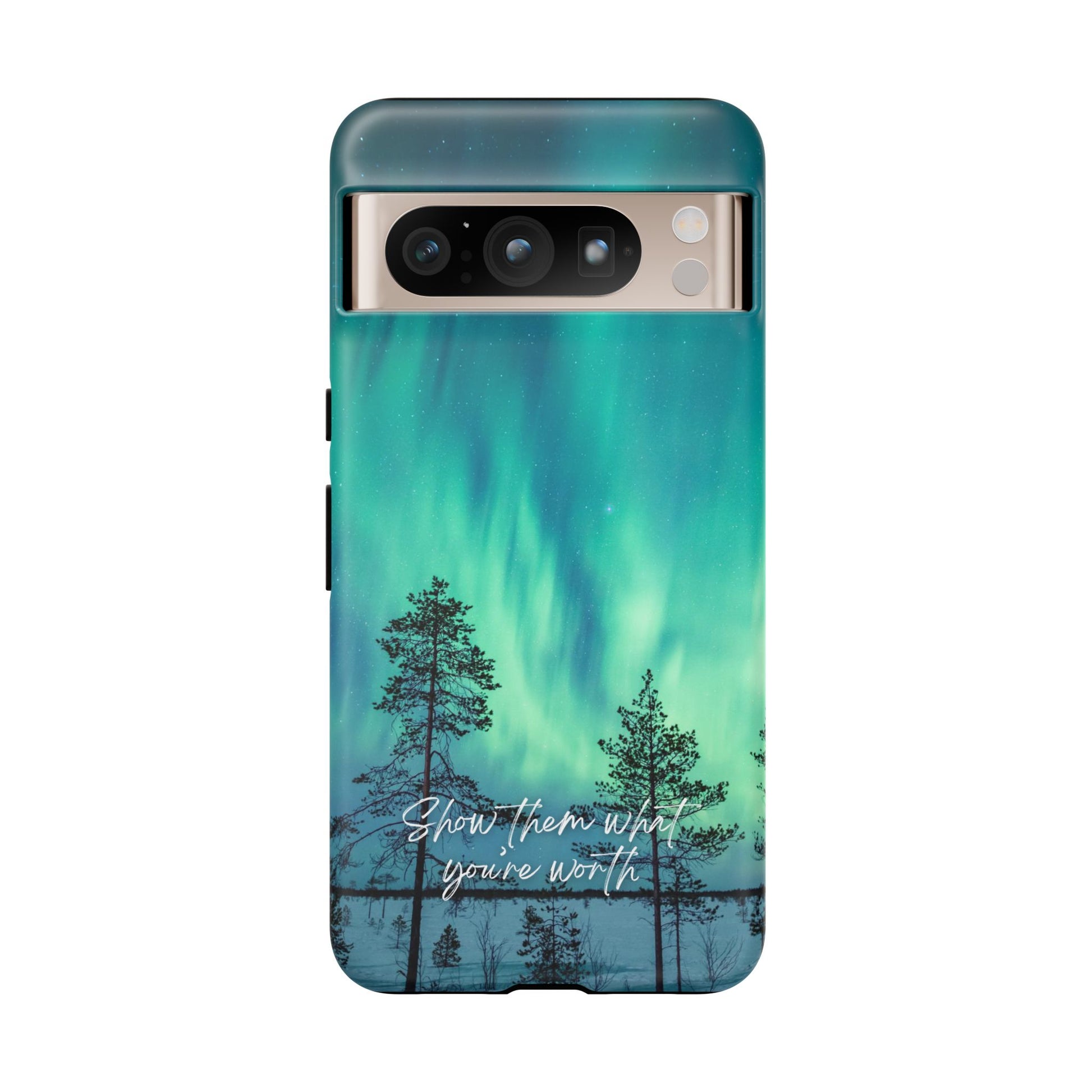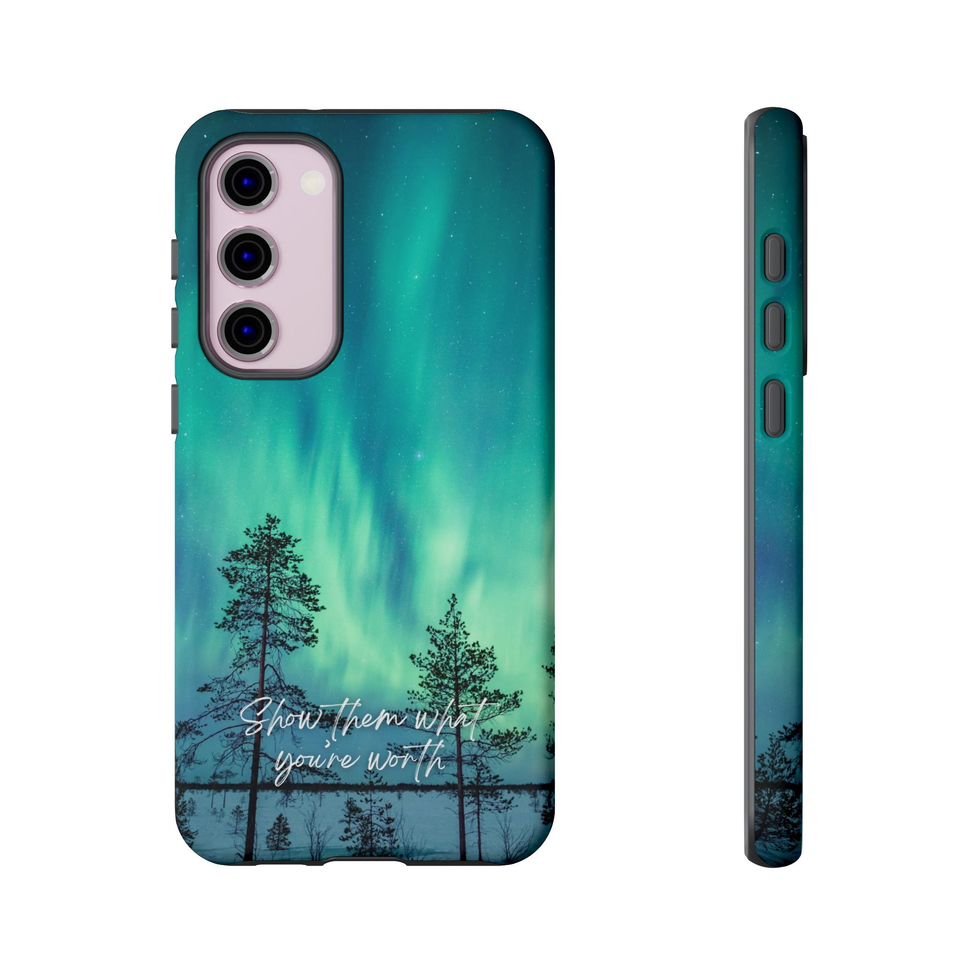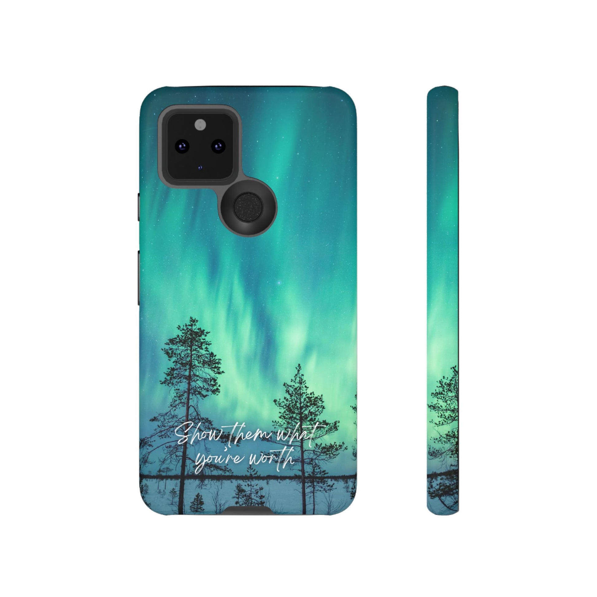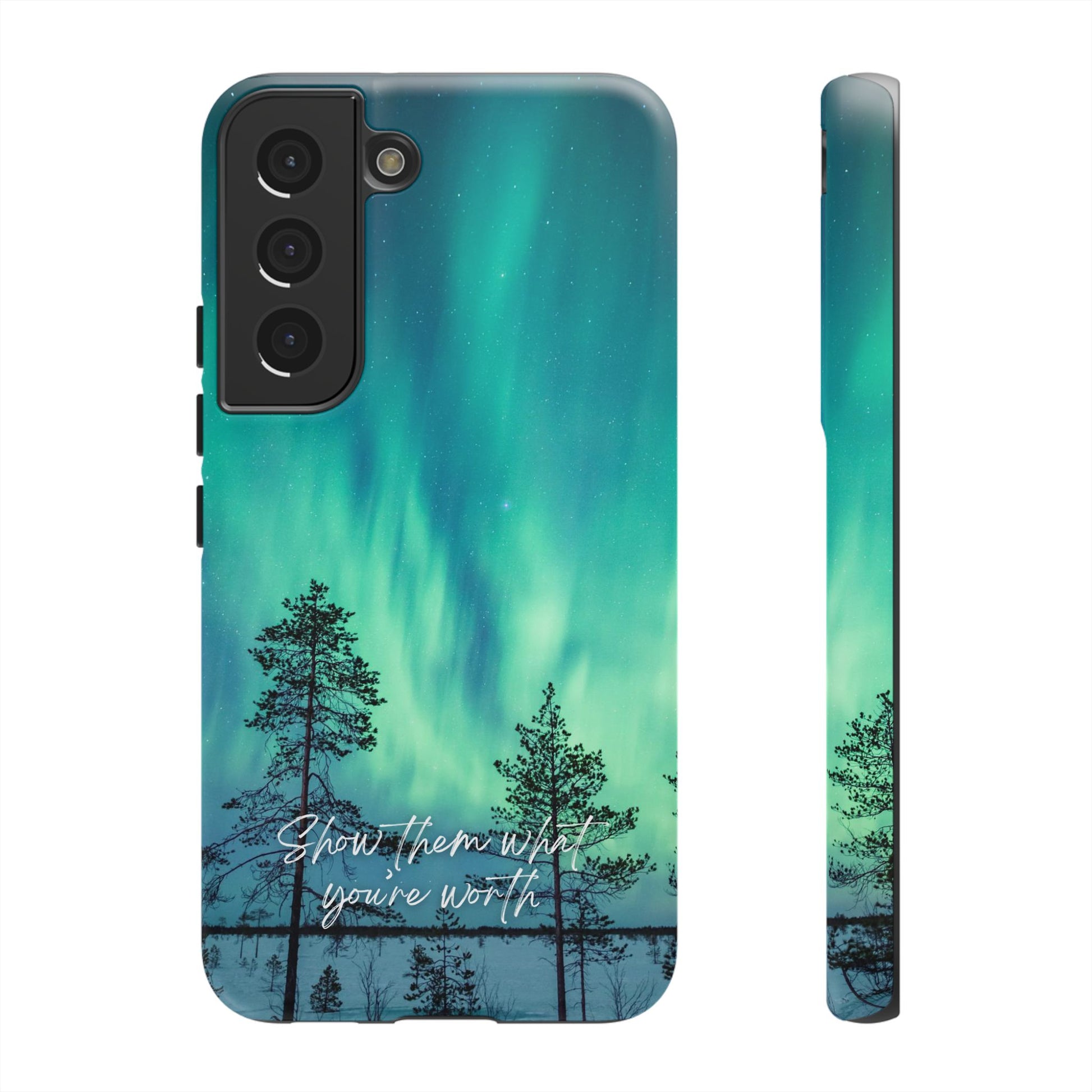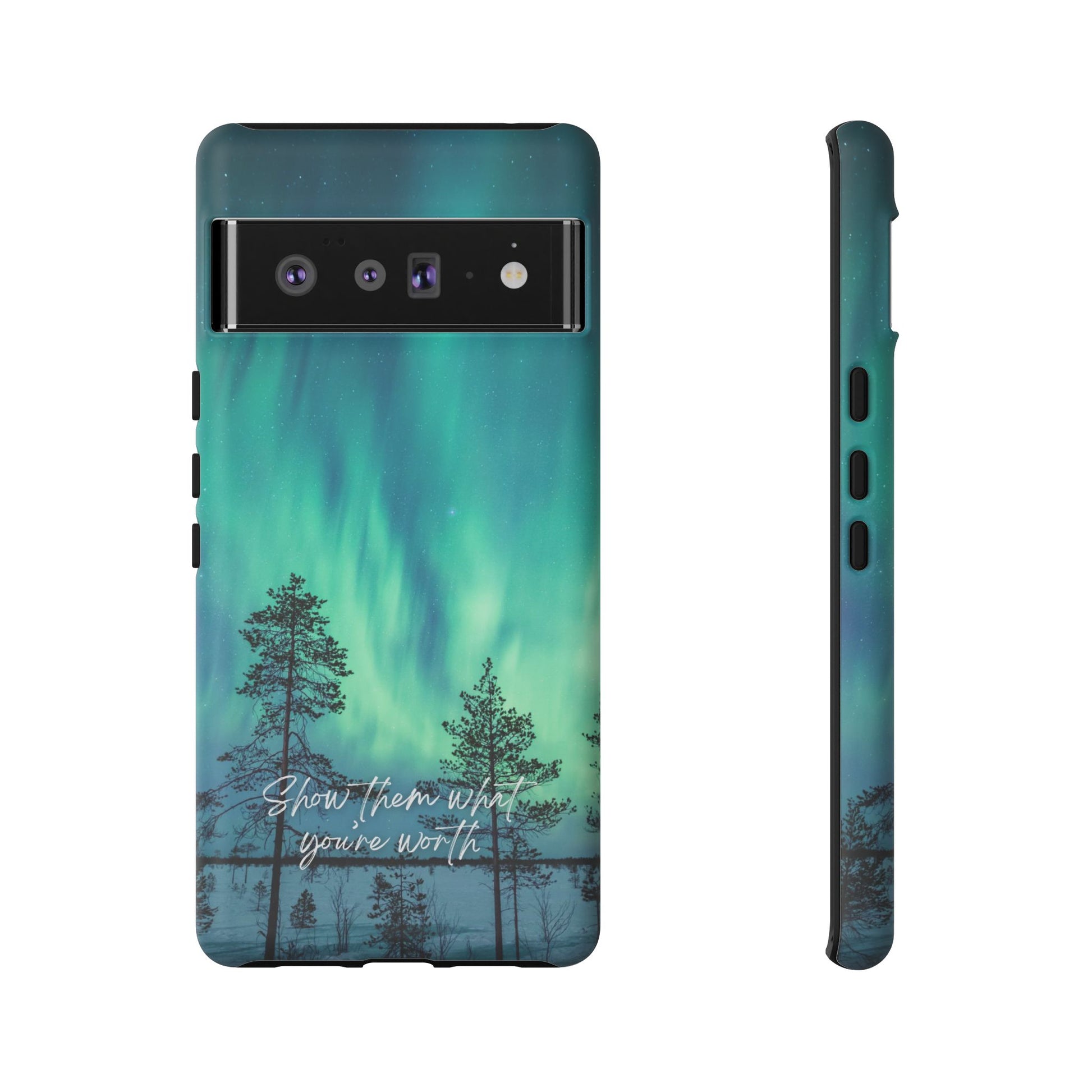 Designed to fit iPhone, Samsung Galaxy, and Google Pixel devices, this phone case combines functionality with artistry. Its sleek design protects your phone while displaying a breathtaking depiction of the Northern Lights. To add a touch of empowerment, it features an uplifting inscription: *"Show them what you're worth."* Like the Northern Lights themselves, this quote reminds you to shine brightly and inspire others.