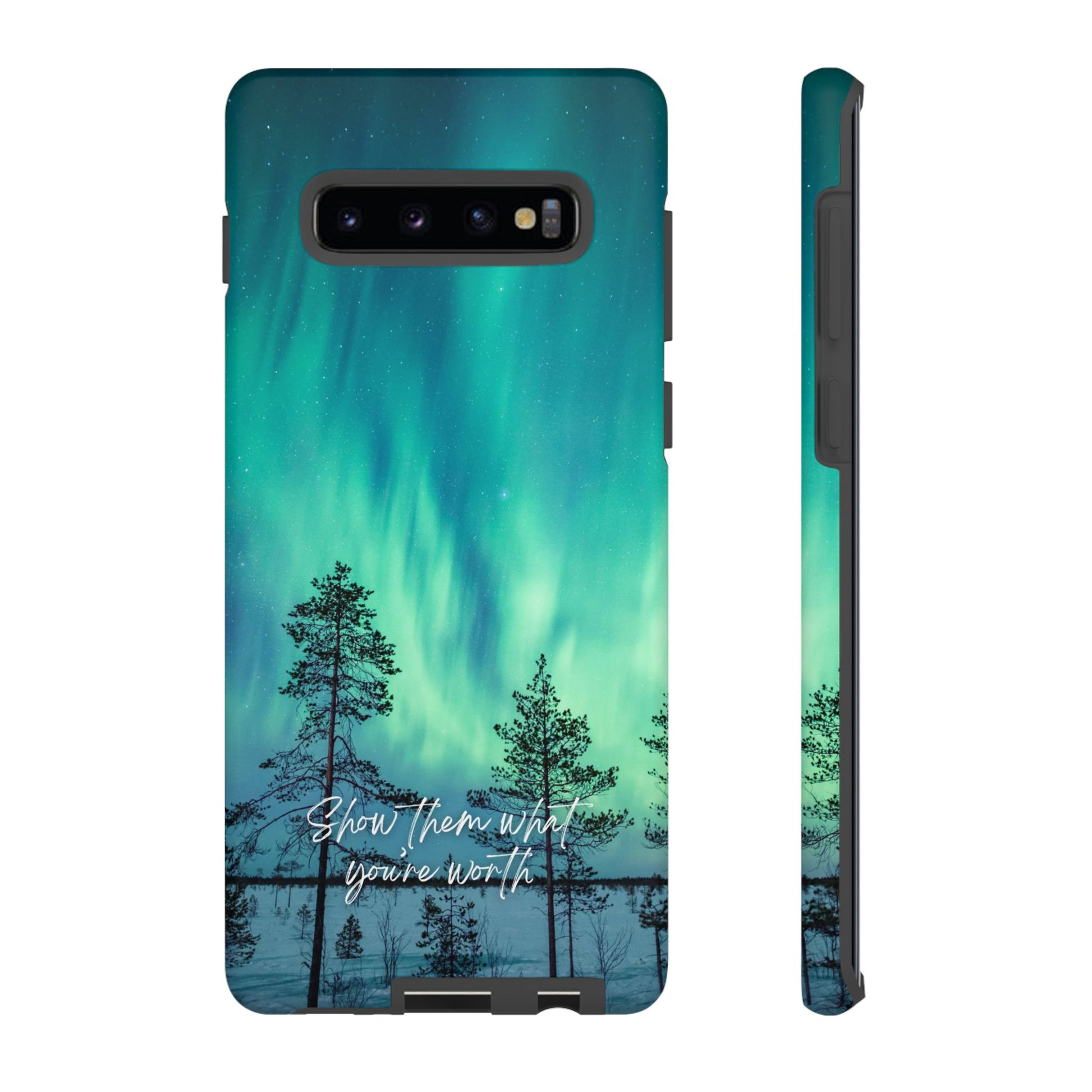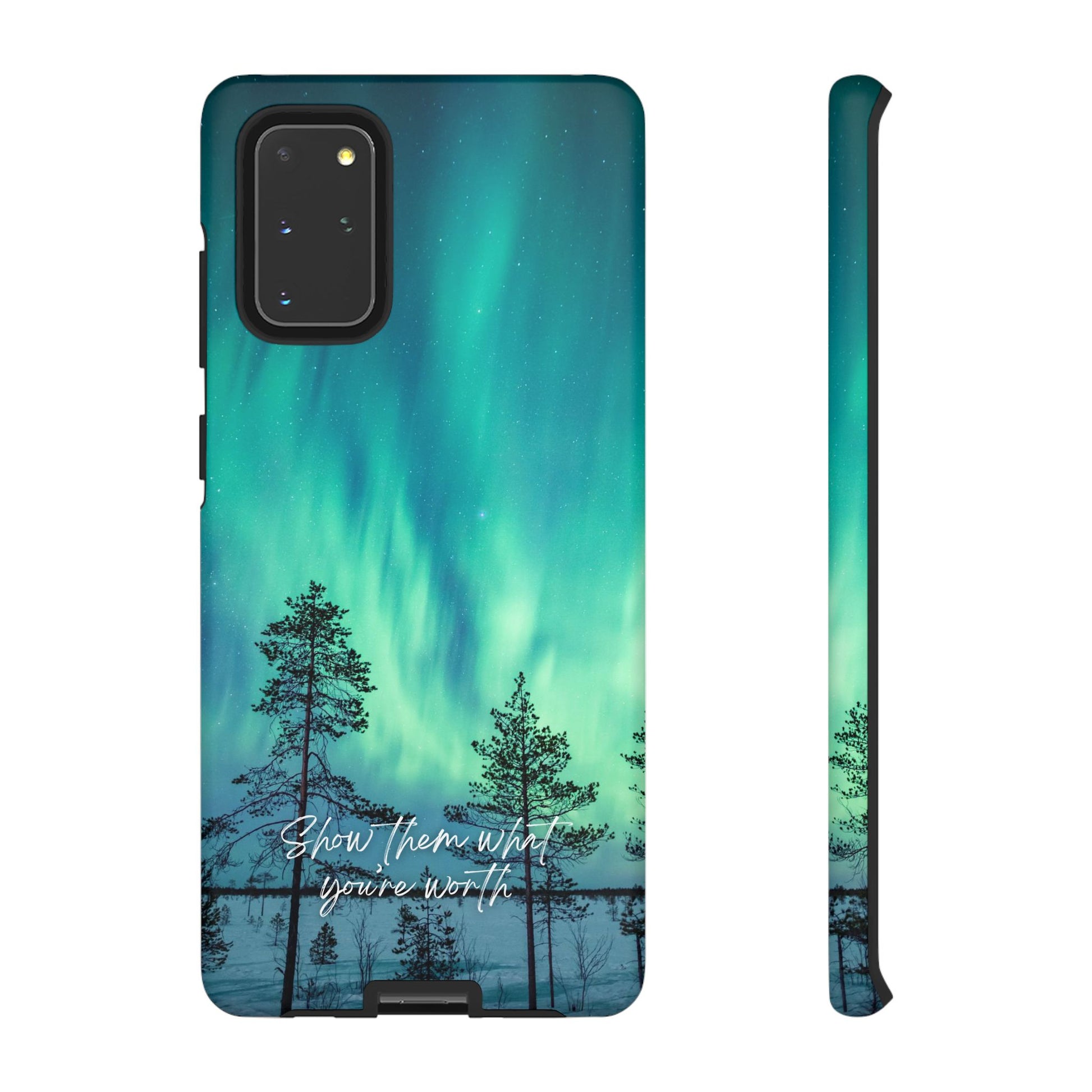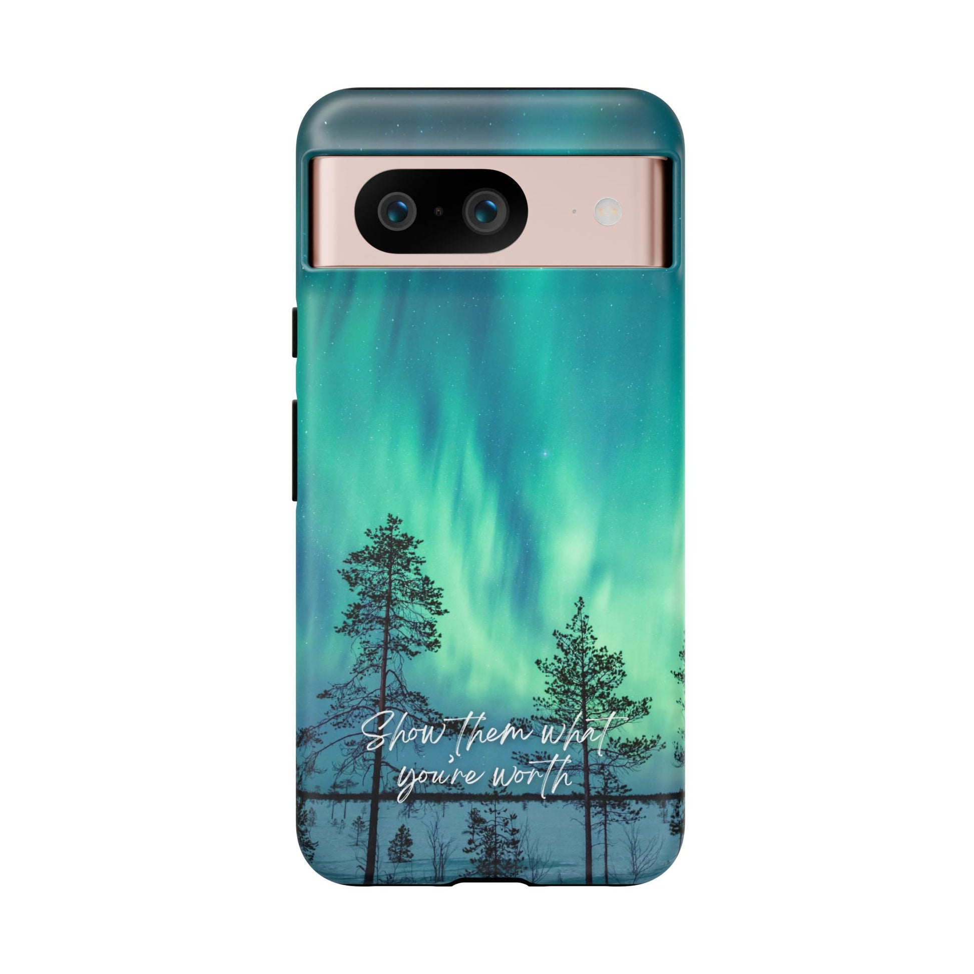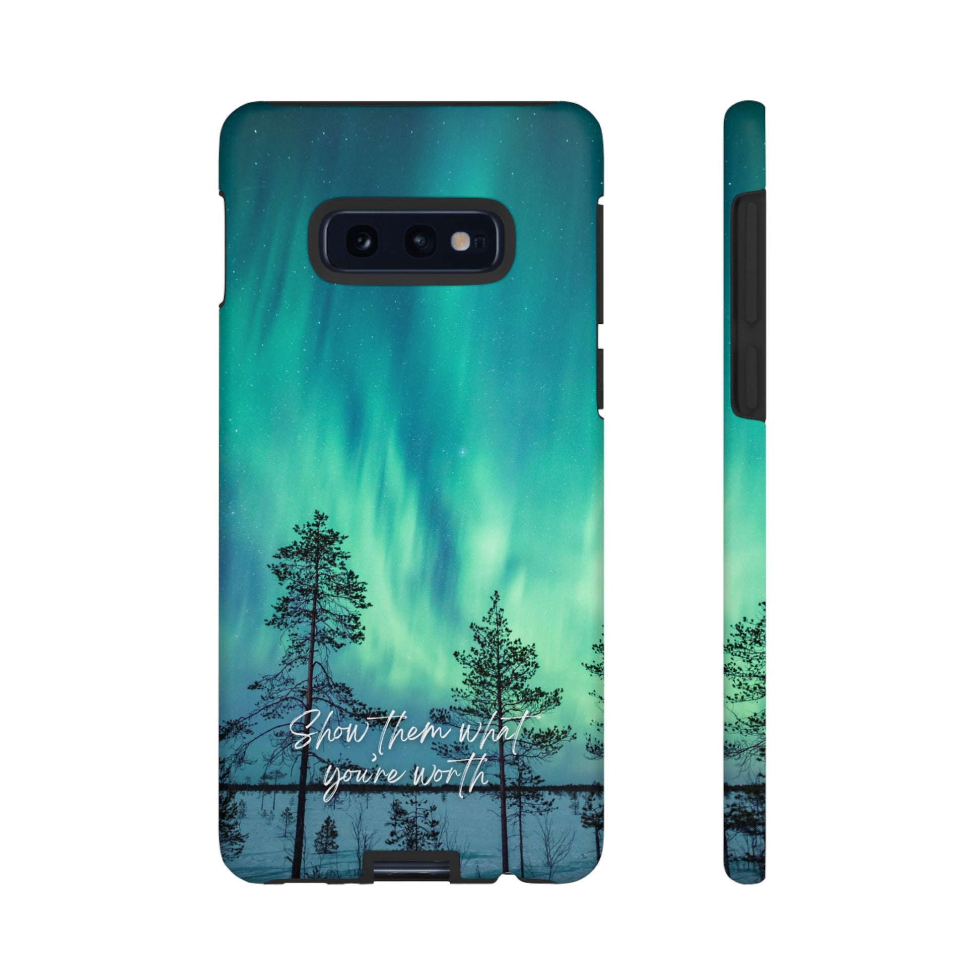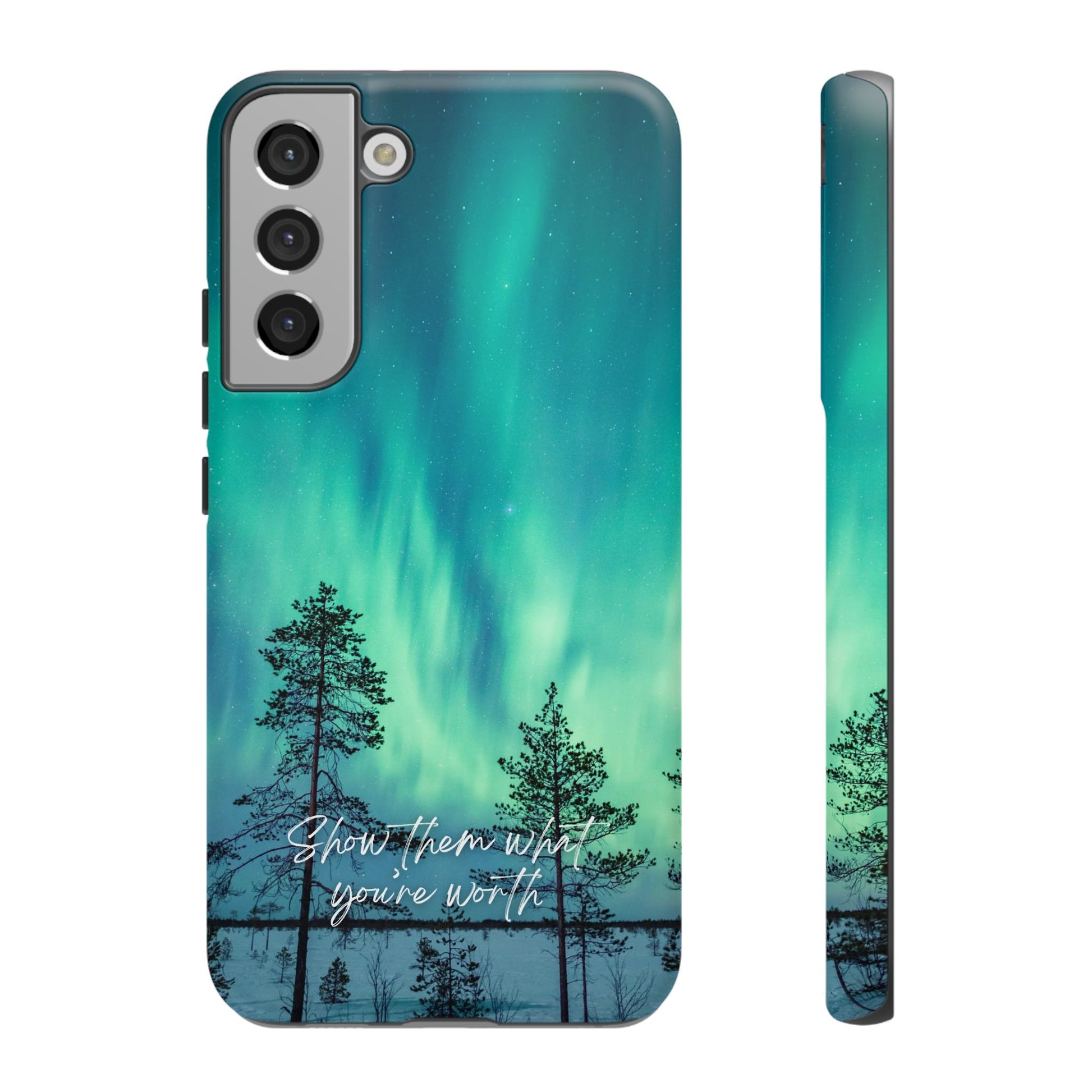 Designed to fit iPhone, Samsung Galaxy, and Google Pixel devices, this phone case combines functionality with artistry. Its sleek design protects your phone while displaying a breathtaking depiction of the Northern Lights. To add a touch of empowerment, it features an uplifting inscription: *"Show them what you're worth."* Like the Northern Lights themselves, this quote reminds you to shine brightly and inspire others.
