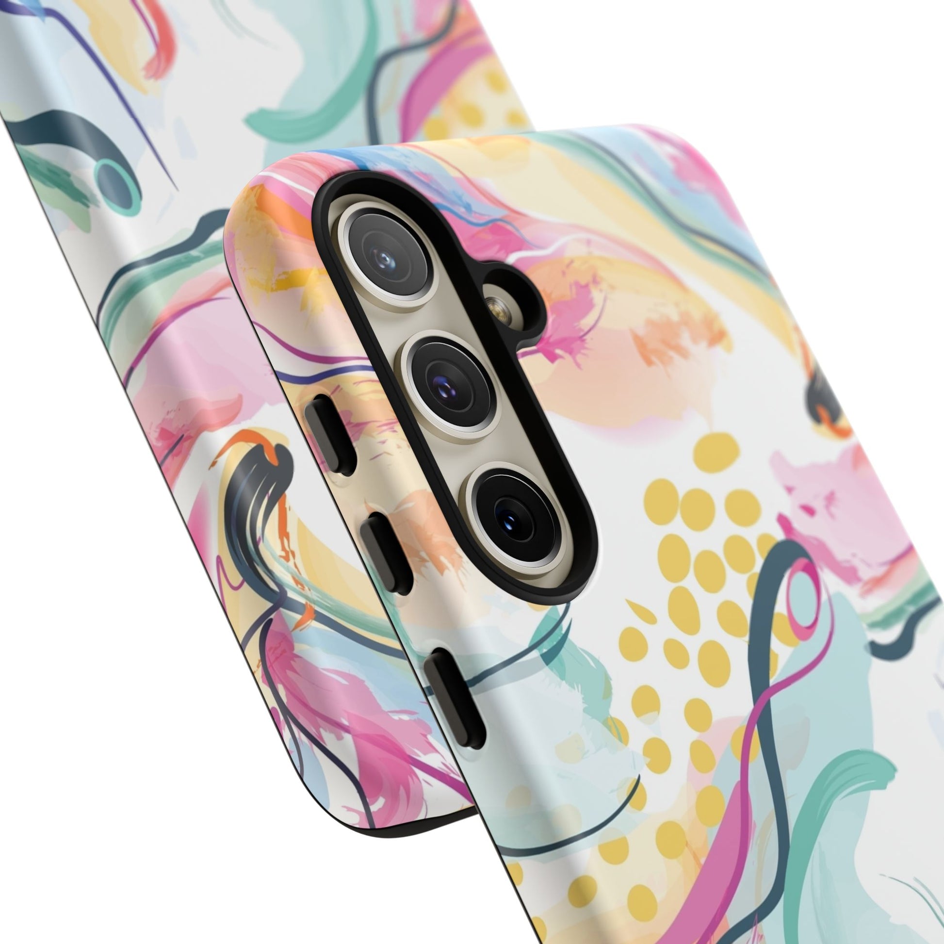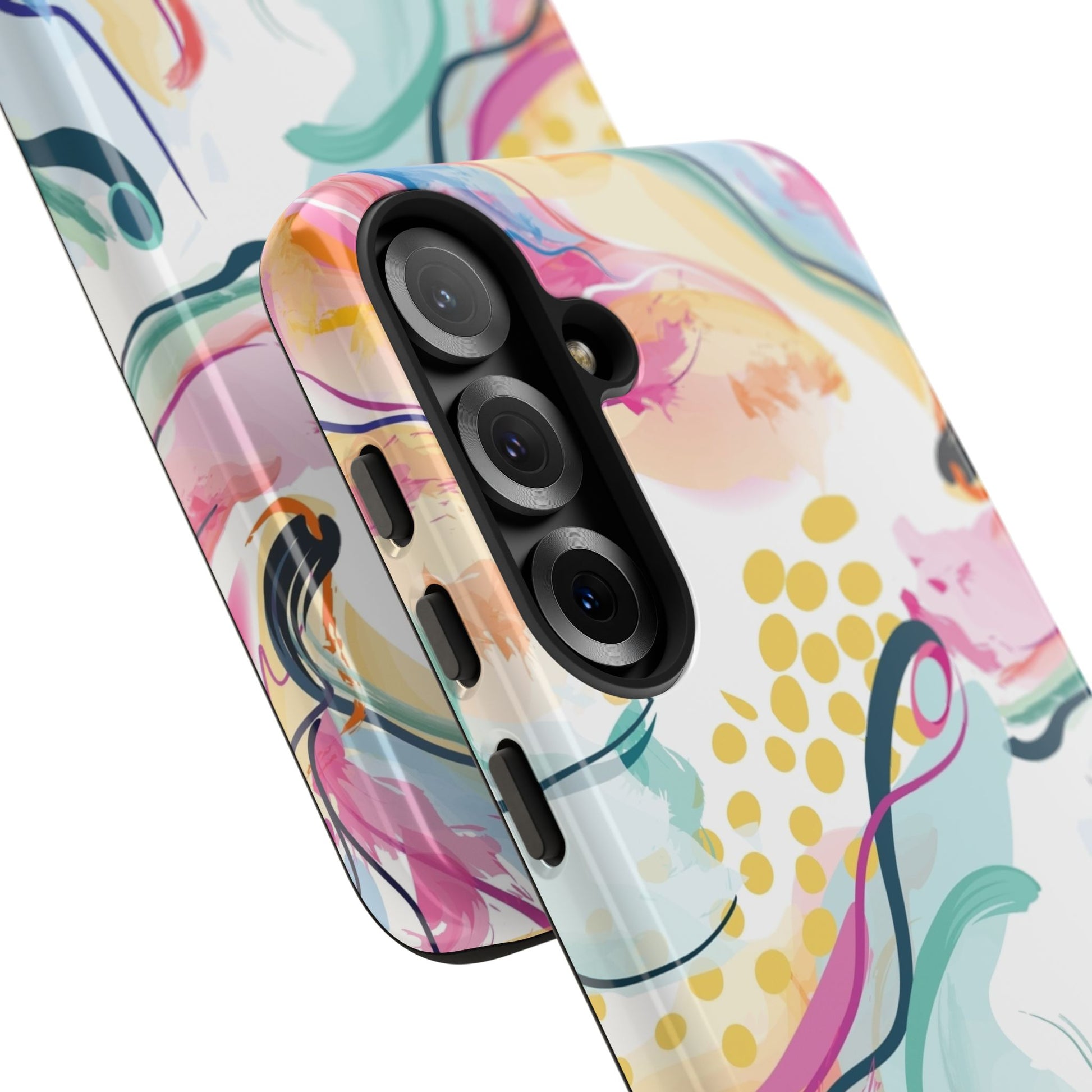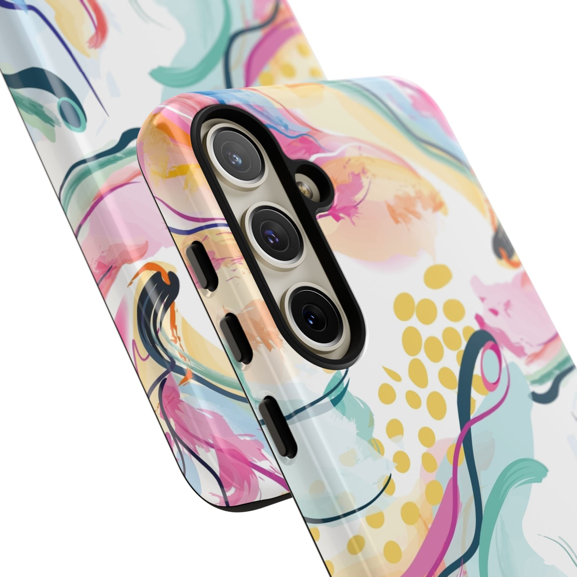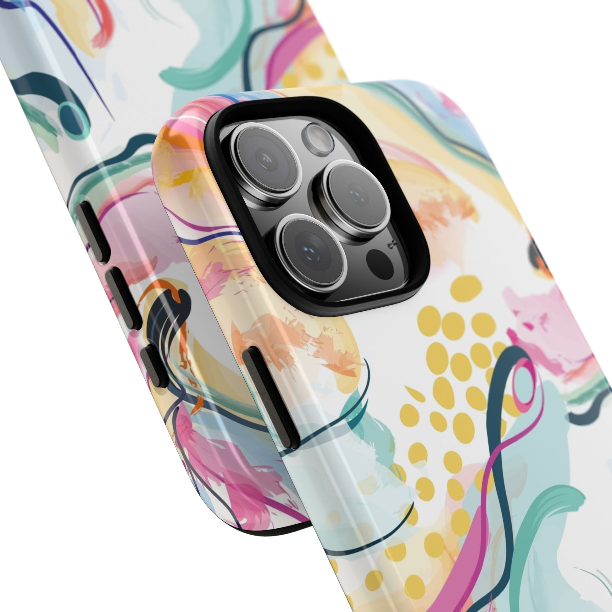 Turn your device into a canvas of inspiration with this colorful phone case, designed for iPhone, Samsung Galaxy, and Google Pixel devices. This striking accessory blends abstract art and dynamic shapes, all infused with green, blue, yellow, orange, pink, and purple hues—a vibrant fusion that feels alive with creativity and motion.