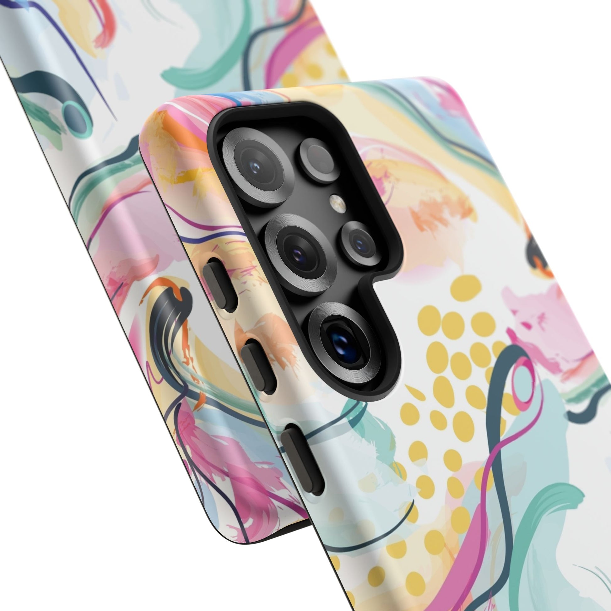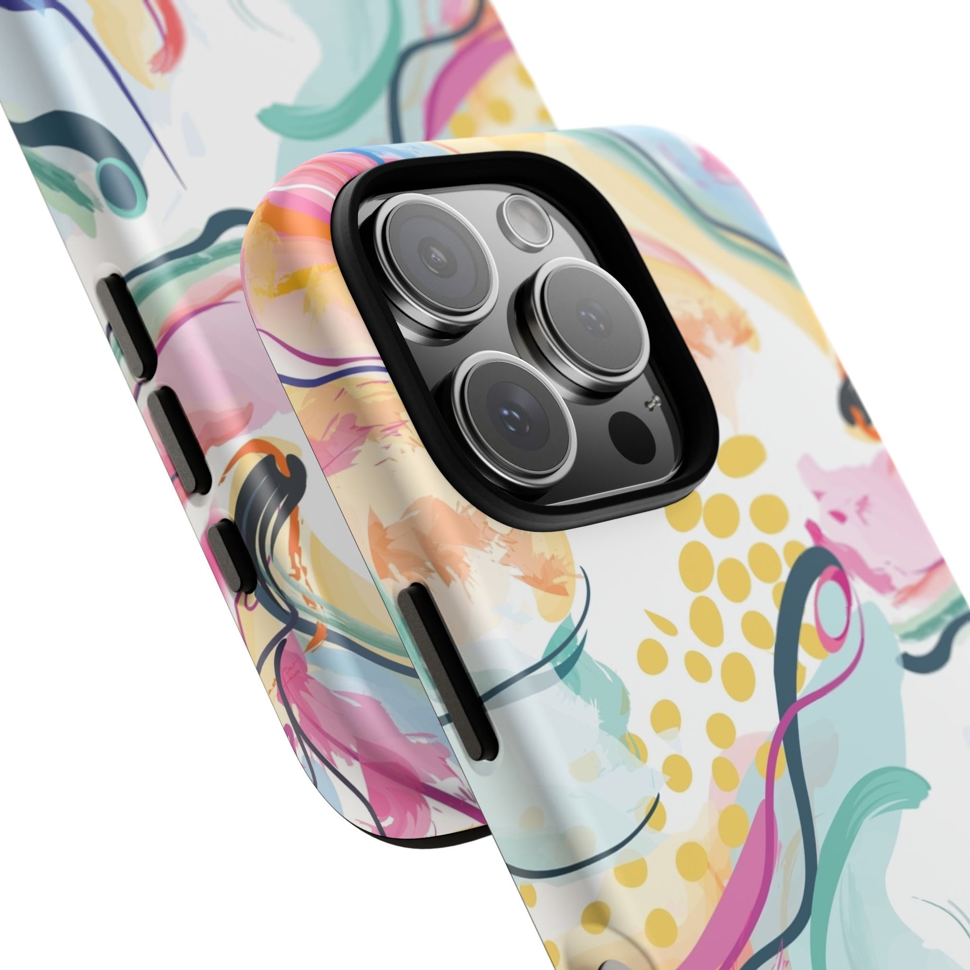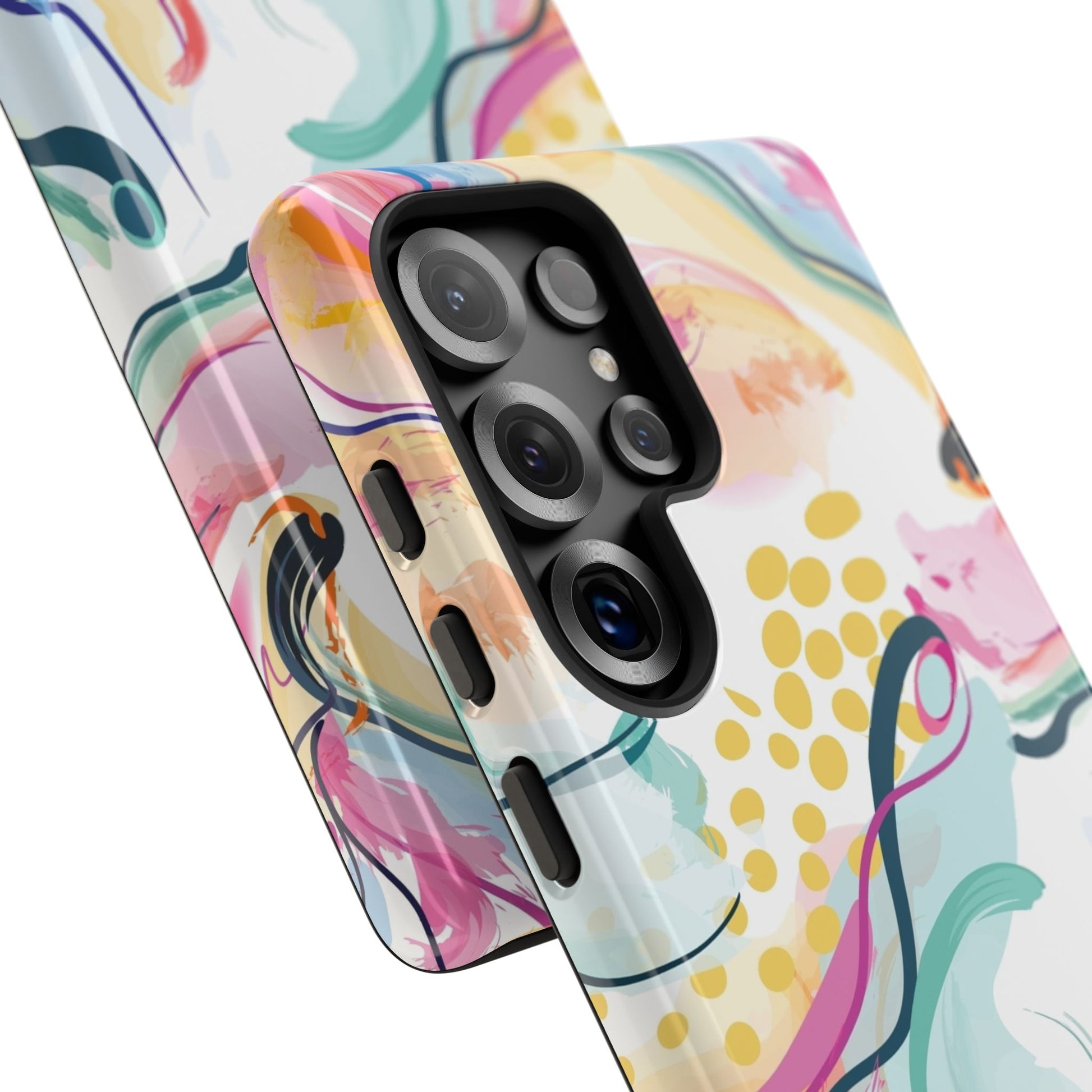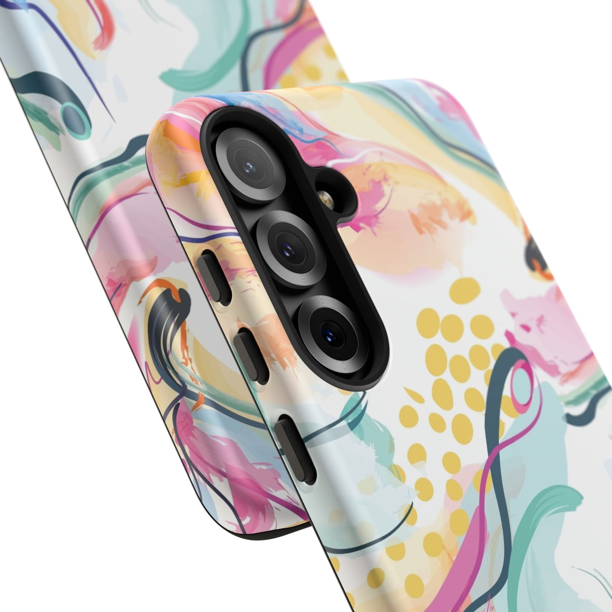Turn your device into a canvas of inspiration with this colorful phone case, designed for iPhone, Samsung Galaxy, and Google Pixel devices. This striking accessory blends abstract art and dynamic shapes, all infused with green, blue, yellow, orange, pink, and purple hues—a vibrant fusion that feels alive with creativity and motion.